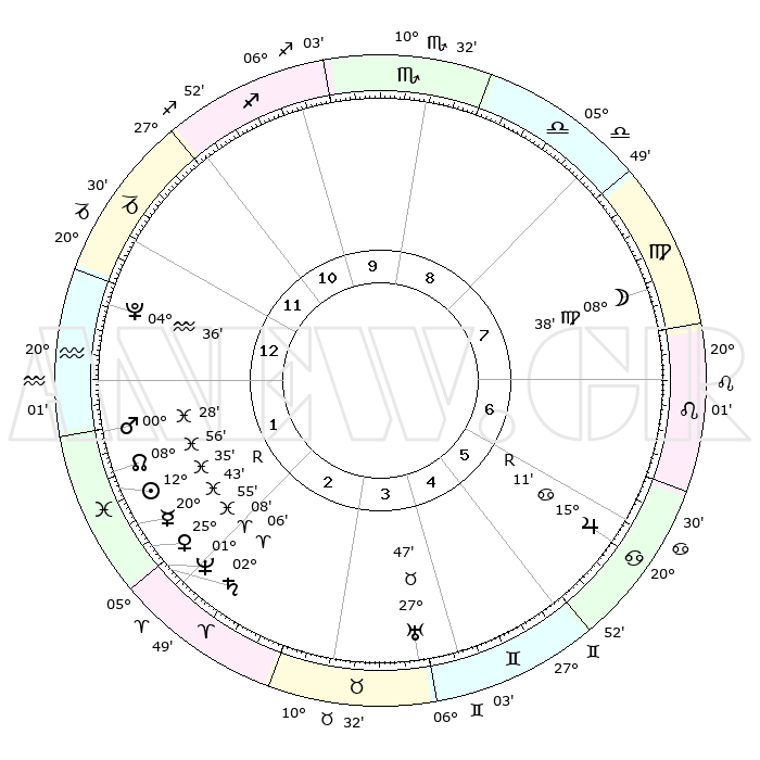 | | ΘΕΣΕΙΣ ΠΛΑΝΗΤΩΝ ΑΣΤΡΟΛΟΓΙΚΟΥ ΧΑΡΤΗ ΤΗΣ ΣΤΙΓΜΗΣ ΑΥΤΗΣ | | | | Πλανήτης | Ζώδιο | Μοίρες | Δεκαήμ. | Σε οίκο | Απόκλιση | | Ακμές των οίκων | | Ηλιος | Ιχθείς | 12°31' | Δεύτερο | 2 | 06 S 52 | | 1ος | 20°58' | Αιγόκερως | | Σελήνη | Παρθένος | 07°46' | Πρώτο | 8 | 08 N 45 | | 2ος | 03°19' | Ιχθείς | | Ερμής | Ιχθείς | 20°46'R | Τρίτο | 2 | 00 S 23 | | 3ος | 12°57' | Κριός | | Αφροδίτη | Ιχθείς | 25°51' | Τρίτο | 2 | 02 S 52 | | 4ος | 13°03' | Ταύρος | | Αρης | Ιχθείς | 00°24' | Πρώτο | 1 | 12 S 21 | | 5ος | 06°36' | Δίδυμοι | | Δίας | Καρκίνος | 15°11'R | Δεύτερο | 6 | 22 N 55 | | 6ος | 27°49' | Δίδυμοι | | Κρόνος | Κριός | 02°05' | Πρώτο | 2 | 01 S 07 | | 7ος | 20°58' | Καρκίνος | | Ουρανός | Ταύρος | 27°47' | Τρίτο | 4 | 19 N 29 | | 8ος | 03°19' | Παρθένος | | Ποσειδώνας | Κριός | 01°08' | Πρώτο | 2 | 00 S 45 | | 9ος | 12°57' | Ζυγός | | Πλούτωνας | Υδροχόος | 04°36' | Πρώτο | 1 | 22 S 52 | | 10ος | 13°03' | Σκορπιός | | Β. Δεσμός | Ιχθείς | 08°56' | Πρώτο | 2 | 08 S 13 | | 11ος | 06°36' | Τοξότης | | Ωροσκόπος | Αιγόκερως | 20°58' | Τρίτο | | | 12ος | 27°49' | Τοξότης | | Μεσουράνημα | Σκορπιός | 13°03' | Δεύτερο | | | |