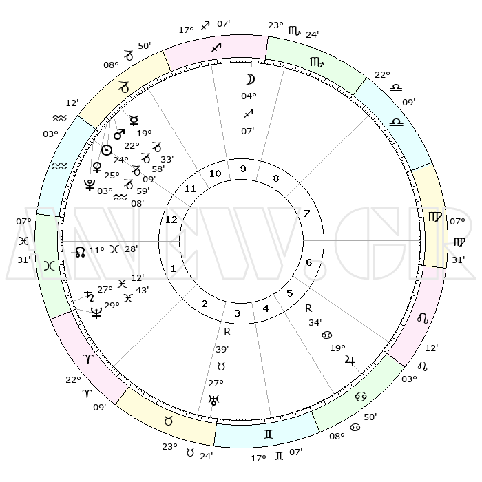 | | ΘΕΣΕΙΣ ΠΛΑΝΗΤΩΝ ΑΣΤΡΟΛΟΓΙΚΟΥ ΧΑΡΤΗ ΤΗΣ ΣΤΙΓΜΗΣ ΑΥΤΗΣ | | | | Πλανήτης | Ζώδιο | Μοίρες | Δεκαήμ. | Σε οίκο | Απόκλιση | | Ακμές των οίκων | | Ηλιος | Αιγόκερως | 24°05' | Τρίτο | 12 | 21 S 17 | | 1ος | 03°44' | Υδροχόος | | Σελήνη | Τοξότης | 03°19' | Πρώτο | 10 | 25 S 48 | | 2ος | 18°24' | Ιχθείς | | Ερμής | Αιγόκερως | 19°27' | Δεύτερο | 12 | 23 S 45 | | 3ος | 26°14' | Κριός | | Αφροδίτη | Αιγόκερως | 25°54' | Τρίτο | 12 | 21 S 54 | | 4ος | 24°04' | Ταύρος | | Αρης | Αιγόκερως | 22°55' | Τρίτο | 12 | 22 S 26 | | 5ος | 16°34' | Δίδυμοι | | Δίας | Καρκίνος | 19°35'R | Δεύτερο | 6 | 22 N 16 | | 6ος | 08°09' | Καρκίνος | | Κρόνος | Ιχθείς | 27°11' | Τρίτο | 2 | 03 S 09 | | 7ος | 03°44' | Λέων | | Ουρανός | Ταύρος | 27°39'R | Τρίτο | 4 | 19 N 26 | | 8ος | 18°24' | Παρθένος | | Ποσειδώνας | Ιχθείς | 29°43' | Τρίτο | 2 | 01 S 20 | | 9ος | 26°14' | Ζυγός | | Πλούτωνας | Υδροχόος | 03°08' | Πρώτο | 12 | 23 S 08 | | 10ος | 24°04' | Σκορπιός | | Β. Δεσμός | Ιχθείς | 11°28' | Δεύτερο | 1 | 07 S 16 | | 11ος | 16°34' | Τοξότης | | Ωροσκόπος | Υδροχόος | 03°44' | Πρώτο | | | 12ος | 08°09' | Αιγόκερως | | Μεσουράνημα | Σκορπιός | 24°04' | Τρίτο | | | |