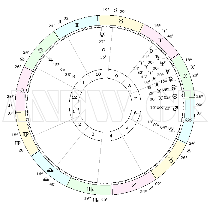 | | ΘΕΣΕΙΣ ΠΛΑΝΗΤΩΝ ΑΣΤΡΟΛΟΓΙΚΟΥ ΧΑΡΤΗ ΤΗΣ ΣΤΙΓΜΗΣ ΑΥΤΗΣ | | | | Πλανήτης | Ζώδιο | Μοίρες | Δεκαήμ. | Σε οίκο | Απόκλιση | | Ακμές των οίκων | | Ηλιος | Ιχθείς | 01°57' | Πρώτο | 8 | 10 S 47 | | 1ος | 07°25' | Λέων | | Σελήνη | Κριός | 10°34' | Δεύτερο | 9 | 06 N 44 | | 2ος | 29°01' | Λέων | | Ερμής | Ιχθείς | 19°58' | Δεύτερο | 8 | 02 S 41 | | 3ος | 25°05' | Παρθένος | | Αφροδίτη | Ιχθείς | 12°43' | Δεύτερο | 8 | 08 S 07 | | 4ος | 26°55' | Ζυγός | | Αρης | Υδροχόος | 22°07' | Τρίτο | 7 | 15 S 10 | | 5ος | 02°41' | Τοξότης | | Δίας | Καρκίνος | 15°39'R | Δεύτερο | 12 | 22 N 51 | | 6ος | 07°12' | Αιγόκερως | | Κρόνος | Κριός | 00°51' | Πρώτο | 9 | 01 S 38 | | 7ος | 07°25' | Υδροχόος | | Ουρανός | Ταύρος | 27°35' | Τρίτο | 10 | 19 N 26 | | 8ος | 29°01' | Υδροχόος | | Ποσειδώνας | Κριός | 00°45' | Πρώτο | 9 | 00 S 54 | | 9ος | 25°05' | Ιχθείς | | Πλούτωνας | Υδροχόος | 04°18' | Πρώτο | 6 | 22 S 55 | | 10ος | 26°55' | Κριός | | Β. Δεσμός | Ιχθείς | 09°29' | Πρώτο | 8 | 08 S 01 | | 11ος | 02°40' | Δίδυμοι | | Ωροσκόπος | Λέων | 07°25' | Πρώτο | | | 12ος | 07°12' | Καρκίνος | | Μεσουράνημα | Κριός | 26°55' | Τρίτο | | | |