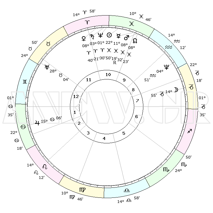 | | ΘΕΣΕΙΣ ΠΛΑΝΗΤΩΝ ΑΣΤΡΟΛΟΓΙΚΟΥ ΧΑΡΤΗ ΤΗΣ ΣΤΙΓΜΗΣ ΑΥΤΗΣ | | | | Πλανήτης | Ζώδιο | Μοίρες | Δεκαήμ. | Σε οίκο | Απόκλιση | | Ακμές των οίκων | | Ηλιος | Ιχθείς | 22°46' | Τρίτο | 11 | 02 S 52 | | 1ος | 11°14' | Δίδυμοι | | Σελήνη | Αιγόκερως | 14°13' | Δεύτερο | 8 | 26 S 57 | | 2ος | 04°02' | Καρκίνος | | Ερμής | Ιχθείς | 11°22'R | Δεύτερο | 10 | 04 S 44 | | 3ος | 25°15' | Καρκίνος | | Αφροδίτη | Κριός | 08°35' | Πρώτο | 11 | 02 N 24 | | 4ος | 19°02' | Λέων | | Αρης | Ιχθείς | 08°29' | Πρώτο | 10 | 09 S 24 | | 5ος | 19°32' | Παρθένος | | Δίας | Καρκίνος | 15°06' | Δεύτερο | 2 | 22 N 56 | | 6ος | 29°23' | Ζυγός | | Κρόνος | Κριός | 03°20' | Πρώτο | 11 | 00 S 37 | | 7ος | 11°14' | Τοξότης | | Ουρανός | Ταύρος | 28°04' | Τρίτο | 12 | 19 N 33 | | 8ος | 04°02' | Αιγόκερως | | Ποσειδώνας | Κριός | 01°30' | Πρώτο | 11 | 00 S 36 | | 9ος | 25°15' | Αιγόκερως | | Πλούτωνας | Υδροχόος | 04°51' | Πρώτο | 9 | 22 S 50 | | 10ος | 19°01' | Υδροχόος | | Β. Δεσμός | Ιχθείς | 08°23' | Πρώτο | 10 | 08 S 25 | | 11ος | 19°32' | Ιχθείς | | Ωροσκόπος | Δίδυμοι | 11°14' | Δεύτερο | | | 12ος | 29°23' | Κριός | | Μεσουράνημα | Υδροχόος | 19°01' | Δεύτερο | | | |