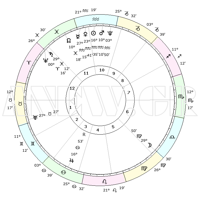 | | ΘΕΣΕΙΣ ΠΛΑΝΗΤΩΝ ΑΣΤΡΟΛΟΓΙΚΟΥ ΧΑΡΤΗ ΤΗΣ ΣΤΙΓΜΗΣ ΑΥΤΗΣ | | | | Πλανήτης | Ζώδιο | Μοίρες | Δεκαήμ. | Σε οίκο | Απόκλιση | | Ακμές των οίκων | | Ηλιος | Υδροχόος | 16°31' | Δεύτερο | 11 | 15 S 53 | | 1ος | 14°32' | Κριός | | Σελήνη | Παρθένος | 29°10' | Τρίτο | 6 | 01 S 20 | | 2ος | 21°02' | Ταύρος | | Ερμής | Υδροχόος | 27°10' | Τρίτο | 11 | 13 S 53 | | 3ος | 16°24' | Δίδυμοι | | Αφροδίτη | Υδροχόος | 23°37' | Τρίτο | 11 | 14 S 59 | | 4ος | 08°13' | Καρκίνος | | Αρης | Υδροχόος | 10°08' | Δεύτερο | 11 | 18 S 43 | | 5ος | 01°20' | Λέων | | Δίας | Καρκίνος | 16°54'R | Δεύτερο | 4 | 22 N 41 | | 6ος | 01°08' | Παρθένος | | Κρόνος | Ιχθείς | 29°12' | Τρίτο | 12 | 02 S 18 | | 7ος | 14°32' | Ζυγός | | Ουρανός | Ταύρος | 27°27' | Τρίτο | 2 | 19 N 24 | | 8ος | 21°02' | Σκορπιός | | Ποσειδώνας | Κριός | 00°16' | Πρώτο | 12 | 01 S 06 | | 9ος | 16°24' | Τοξότης | | Πλούτωνας | Υδροχόος | 03°50' | Πρώτο | 11 | 23 S 00 | | 10ος | 08°13' | Αιγόκερως | | Β. Δεσμός | Ιχθείς | 10°18' | Δεύτερο | 12 | 07 S 42 | | 11ος | 01°20' | Υδροχόος | | Ωροσκόπος | Κριός | 14°32' | Δεύτερο | | | 12ος | 01°08' | Ιχθείς | | Μεσουράνημα | Αιγόκερως | 08°13' | Πρώτο | | | |