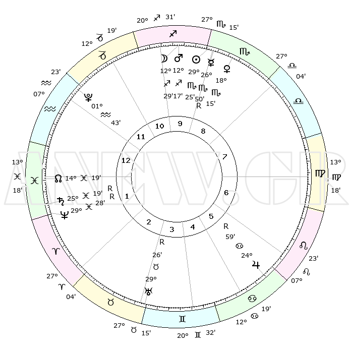 | | ΘΕΣΕΙΣ ΠΛΑΝΗΤΩΝ ΑΣΤΡΟΛΟΓΙΚΟΥ ΧΑΡΤΗ ΤΗΣ ΣΤΙΓΜΗΣ ΑΥΤΗΣ | | | | Πλανήτης | Ζώδιο | Μοίρες | Δεκαήμ. | Σε οίκο | Απόκλιση | | Ακμές των οίκων | | Ηλιος | Σκορπιός | 29°22' | Τρίτο | 9 | 20 S 01 | | 1ος | 21°24' | Υδροχόος | | Σελήνη | Τοξότης | 12°00' | Δεύτερο | 10 | 27 S 10 | | 2ος | 07°13' | Κριός | | Ερμής | Σκορπιός | 26°53'R | Τρίτο | 9 | 18 S 35 | | 3ος | 11°39' | Ταύρος | | Αφροδίτη | Σκορπιός | 18°12' | Δεύτερο | 9 | 16 S 16 | | 4ος | 06°59' | Δίδυμοι | | Αρης | Τοξότης | 12°16' | Δεύτερο | 10 | 22 S 50 | | 5ος | 28°46' | Δίδυμοι | | Δίας | Καρκίνος | 24°60'R | Τρίτο | 6 | 21 N 16 | | 6ος | 21°31' | Καρκίνος | | Κρόνος | Ιχθείς | 25°19'R | Τρίτο | 1 | 04 S 04 | | 7ος | 21°24' | Λέων | | Ουρανός | Ταύρος | 29°27'R | Τρίτο | 3 | 19 N 49 | | 8ος | 07°13' | Ζυγός | | Ποσειδώνας | Ιχθείς | 29°28'R | Τρίτο | 1 | 01 S 27 | | 9ος | 11°39' | Σκορπιός | | Πλούτωνας | Υδροχόος | 01°43' | Πρώτο | 12 | 23 S 27 | | 10ος | 06°59' | Τοξότης | | Β. Δεσμός | Ιχθείς | 14°19' | Δεύτερο | 1 | 06 S 10 | | 11ος | 28°46' | Τοξότης | | Ωροσκόπος | Υδροχόος | 21°24' | Τρίτο | | | 12ος | 21°31' | Αιγόκερως | | Μεσουράνημα | Τοξότης | 06°59' | Πρώτο | | | |