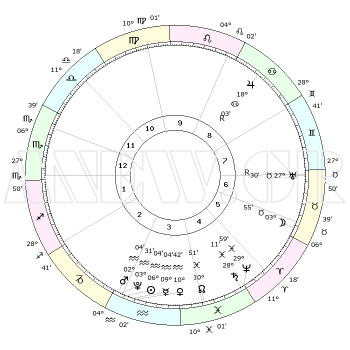 | | ΘΕΣΕΙΣ ΠΛΑΝΗΤΩΝ ΑΣΤΡΟΛΟΓΙΚΟΥ ΧΑΡΤΗ ΤΗΣ ΣΤΙΓΜΗΣ ΑΥΤΗΣ | | | | Πλανήτης | Ζώδιο | Μοίρες | Δεκαήμ. | Σε οίκο | Απόκλιση | | Ακμές των οίκων | | Ηλιος | Υδροχόος | 05°60' | Πρώτο | 3 | 18 S 46 | | 1ος | 07°55' | Σκορπιός | | Σελήνη | Ταύρος | 02°57' | Πρώτο | 6 | 16 N 26 | | 2ος | 06°50' | Τοξότης | | Ερμής | Υδροχόος | 08°57' | Πρώτο | 3 | 20 S 01 | | 3ος | 09°30' | Αιγόκερως | | Αφροδίτη | Υδροχόος | 10°37' | Δεύτερο | 3 | 18 S 47 | | 4ος | 14°16' | Υδροχόος | | Αρης | Υδροχόος | 02°01' | Πρώτο | 3 | 20 S 42 | | 5ος | 17°01' | Ιχθείς | | Δίας | Καρκίνος | 18°04'R | Δεύτερο | 9 | 22 N 30 | | 6ος | 14°53' | Κριός | | Κρόνος | Ιχθείς | 28°11' | Τρίτο | 5 | 02 S 44 | | 7ος | 07°55' | Ταύρος | | Ουρανός | Ταύρος | 27°30'R | Τρίτο | 7 | 19 N 25 | | 8ος | 06°50' | Δίδυμοι | | Ποσειδώνας | Ιχθείς | 29°59' | Τρίτο | 5 | 01 S 13 | | 9ος | 09°30' | Καρκίνος | | Πλούτωνας | Υδροχόος | 03°31' | Πρώτο | 3 | 23 S 04 | | 10ος | 14°16' | Λέων | | Β. Δεσμός | Ιχθείς | 10°51' | Δεύτερο | 4 | 07 S 30 | | 11ος | 17°01' | Παρθένος | | Ωροσκόπος | Σκορπιός | 07°55' | Πρώτο | | | 12ος | 14°53' | Ζυγός | | Μεσουράνημα | Λέων | 14°16' | Δεύτερο | | | |