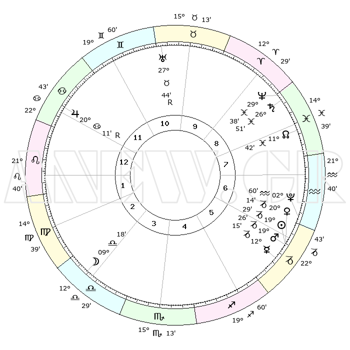 | | ΘΕΣΕΙΣ ΠΛΑΝΗΤΩΝ ΑΣΤΡΟΛΟΓΙΚΟΥ ΧΑΡΤΗ ΤΗΣ ΣΤΙΓΜΗΣ ΑΥΤΗΣ | | | | Πλανήτης | Ζώδιο | Μοίρες | Δεκαήμ. | Σε οίκο | Απόκλιση | | Ακμές των οίκων | | Ηλιος | Αιγόκερως | 18°46' | Δεύτερο | 2 | 22 S 07 | | 1ος | 16°59' | Σκορπιός | | Σελήνη | Ζυγός | 00°31' | Πρώτο | 11 | 01 S 50 | | 2ος | 16°39' | Τοξότης | | Ερμής | Αιγόκερως | 11°08' | Δεύτερο | 2 | 24 S 19 | | 3ος | 20°23' | Αιγόκερως | | Αφροδίτη | Αιγόκερως | 19°20' | Δεύτερο | 2 | 22 S 49 | | 4ος | 25°48' | Υδροχόος | | Αρης | Αιγόκερως | 18°53' | Δεύτερο | 2 | 23 S 02 | | 5ος | 28°05' | Ιχθείς | | Δίας | Καρκίνος | 20°17'R | Τρίτο | 8 | 22 N 09 | | 6ος | 24°53' | Κριός | | Κρόνος | Ιχθείς | 26°48' | Τρίτο | 4 | 03 S 19 | | 7ος | 16°59' | Ταύρος | | Ουρανός | Ταύρος | 27°45'R | Τρίτο | 7 | 19 N 28 | | 8ος | 16°39' | Δίδυμοι | | Ποσειδώνας | Ιχθείς | 29°38' | Τρίτο | 5 | 01 S 22 | | 9ος | 20°23' | Καρκίνος | | Πλούτωνας | Υδροχόος | 02°58' | Πρώτο | 3 | 23 S 10 | | 10ος | 25°48' | Λέων | | Β. Δεσμός | Ιχθείς | 11°45' | Δεύτερο | 4 | 07 S 09 | | 11ος | 28°05' | Παρθένος | | Ωροσκόπος | Σκορπιός | 16°59' | Δεύτερο | | | 12ος | 24°53' | Ζυγός | | Μεσουράνημα | Λέων | 25°48' | Τρίτο | | | |