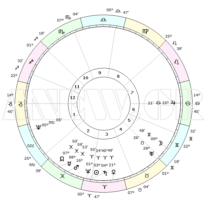 | | ΘΕΣΕΙΣ ΠΛΑΝΗΤΩΝ ΑΣΤΡΟΛΟΓΙΚΟΥ ΧΑΡΤΗ ΤΗΣ ΣΤΙΓΜΗΣ ΑΥΤΗΣ | | | | Πλανήτης | Ζώδιο | Μοίρες | Δεκαήμ. | Σε οίκο | Απόκλιση | | Ακμές των οίκων | | Ηλιος | Κριός | 03°19' | Πρώτο | 3 | 01 N 19 | | 1ος | 21°00' | Τοξότης | | Σελήνη | Δίδυμοι | 08°48' | Πρώτο | 6 | 26 N 56 | | 2ος | 25°59' | Αιγόκερως | | Ερμής | Ιχθείς | 08°58' | Πρώτο | 3 | 07 S 59 | | 3ος | 05°04' | Ιχθείς | | Αφροδίτη | Κριός | 21°44' | Τρίτο | 4 | 07 N 46 | | 4ος | 10°14' | Κριός | | Αρης | Ιχθείς | 16°49' | Δεύτερο | 3 | 06 S 11 | | 5ος | 08°02' | Ταύρος | | Δίας | Καρκίνος | 15°21' | Δεύτερο | 7 | 22 N 55 | | 6ος | 00°33' | Δίδυμοι | | Κρόνος | Κριός | 04°40' | Πρώτο | 3 | 00 S 06 | | 7ος | 21°00' | Δίδυμοι | | Ουρανός | Ταύρος | 28°26' | Τρίτο | 5 | 19 N 38 | | 8ος | 25°59' | Καρκίνος | | Ποσειδώνας | Κριός | 01°54' | Πρώτο | 3 | 00 S 26 | | 9ος | 05°04' | Παρθένος | | Πλούτωνας | Υδροχόος | 05°04' | Πρώτο | 2 | 22 S 48 | | 10ος | 10°14' | Ζυγός | | Β. Δεσμός | Ιχθείς | 07°50' | Πρώτο | 3 | 08 S 38 | | 11ος | 08°02' | Σκορπιός | | Ωροσκόπος | Τοξότης | 21°00' | Τρίτο | | | 12ος | 00°33' | Τοξότης | | Μεσουράνημα | Ζυγός | 10°14' | Δεύτερο | | | |
