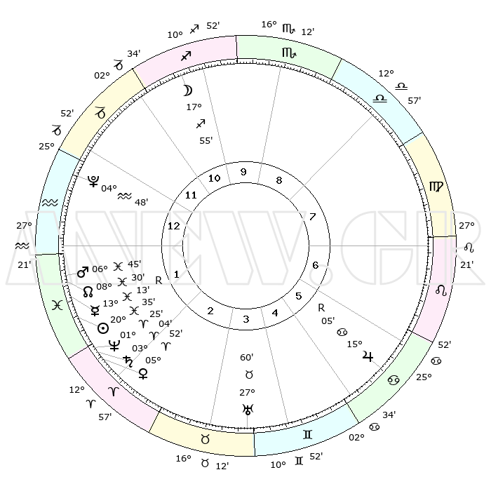 | | ΘΕΣΕΙΣ ΠΛΑΝΗΤΩΝ ΑΣΤΡΟΛΟΓΙΚΟΥ ΧΑΡΤΗ ΤΗΣ ΣΤΙΓΜΗΣ ΑΥΤΗΣ | | | | Πλανήτης | Ζώδιο | Μοίρες | Δεκαήμ. | Σε οίκο | Απόκλιση | | Ακμές των οίκων | | Ηλιος | Ιχθείς | 20°28' | Τρίτο | 2 | 03 S 47 | | 1ος | 06°60' | Αιγόκερως | | Σελήνη | Τοξότης | 16°32' | Δεύτερο | 12 | 27 S 57 | | 2ος | 15°56' | Υδροχόος | | Ερμής | Ιχθείς | 13°20'R | Δεύτερο | 2 | 03 S 34 | | 3ος | 26°14' | Ιχθείς | | Αφροδίτη | Κριός | 05°43' | Πρώτο | 3 | 01 N 13 | | 4ος | 28°58' | Κριός | | Αρης | Ιχθείς | 06°40' | Πρώτο | 2 | 10 S 05 | | 5ος | 24°13' | Ταύρος | | Δίας | Καρκίνος | 15°05'R | Δεύτερο | 7 | 22 N 56 | | 6ος | 15°39' | Δίδυμοι | | Κρόνος | Κριός | 03°03' | Πρώτο | 3 | 00 S 44 | | 7ος | 06°60' | Καρκίνος | | Ουρανός | Ταύρος | 27°59' | Τρίτο | 5 | 19 N 32 | | 8ος | 15°56' | Λέων | | Ποσειδώνας | Κριός | 01°25' | Πρώτο | 3 | 00 S 38 | | 9ος | 26°14' | Παρθένος | | Πλούτωνας | Υδροχόος | 04°48' | Πρώτο | 1 | 22 S 50 | | 10ος | 28°58' | Ζυγός | | Β. Δεσμός | Ιχθείς | 08°31' | Πρώτο | 2 | 08 S 23 | | 11ος | 24°13' | Σκορπιός | | Ωροσκόπος | Αιγόκερως | 06°60' | Πρώτο | | | 12ος | 15°39' | Τοξότης | | Μεσουράνημα | Ζυγός | 28°58' | Τρίτο | | | |