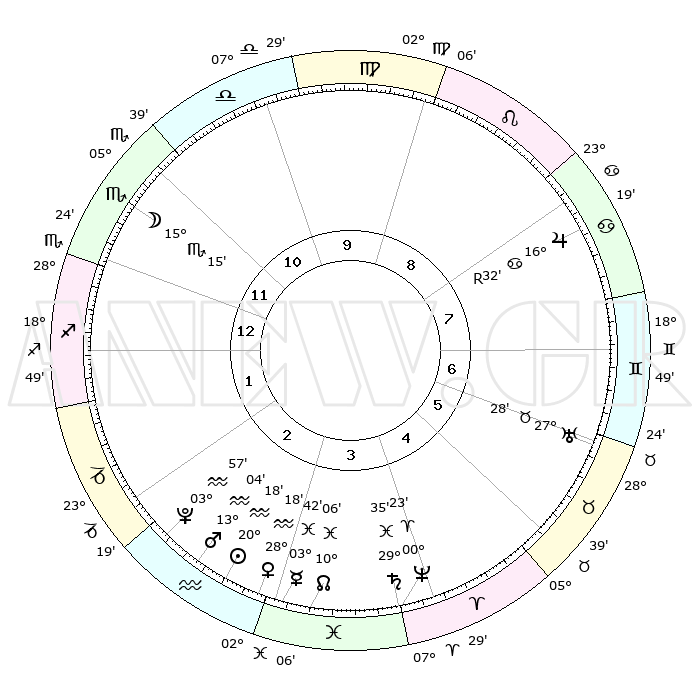 | | ΘΕΣΕΙΣ ΠΛΑΝΗΤΩΝ ΑΣΤΡΟΛΟΓΙΚΟΥ ΧΑΡΤΗ ΤΗΣ ΣΤΙΓΜΗΣ ΑΥΤΗΣ | | | | Πλανήτης | Ζώδιο | Μοίρες | Δεκαήμ. | Σε οίκο | Απόκλιση | | Ακμές των οίκων | | Ηλιος | Υδροχόος | 20°14' | Τρίτο | 3 | 14 S 44 | | 1ος | 27°39' | Σκορπιός | | Σελήνη | Σκορπιός | 14°24' | Δεύτερο | 12 | 20 S 43 | | 2ος | 28°28' | Τοξότης | | Ερμής | Ιχθείς | 03°34' | Πρώτο | 3 | 11 S 11 | | 3ος | 03°47' | Υδροχόος | | Αφροδίτη | Υδροχόος | 28°13' | Τρίτο | 3 | 13 S 27 | | 4ος | 09°46' | Ιχθείς | | Αρης | Υδροχόος | 13°00' | Δεύτερο | 3 | 17 S 56 | | 5ος | 11°04' | Κριός | | Δίας | Καρκίνος | 16°32'R | Δεύτερο | 8 | 22 N 44 | | 6ος | 06°27' | Ταύρος | | Κρόνος | Ιχθείς | 29°34' | Τρίτο | 4 | 02 S 09 | | 7ος | 27°39' | Ταύρος | | Ουρανός | Ταύρος | 27°28' | Τρίτο | 6 | 19 N 24 | | 8ος | 28°28' | Δίδυμοι | | Ποσειδώνας | Κριός | 00°23' | Πρώτο | 4 | 01 S 03 | | 9ος | 03°47' | Λέων | | Πλούτωνας | Υδροχόος | 03°57' | Πρώτο | 3 | 22 S 59 | | 10ος | 09°46' | Παρθένος | | Β. Δεσμός | Ιχθείς | 10°06' | Δεύτερο | 4 | 07 S 47 | | 11ος | 11°04' | Ζυγός | | Ωροσκόπος | Σκορπιός | 27°39' | Τρίτο | | | 12ος | 06°27' | Σκορπιός | | Μεσουράνημα | Παρθένος | 09°46' | Πρώτο | | | |