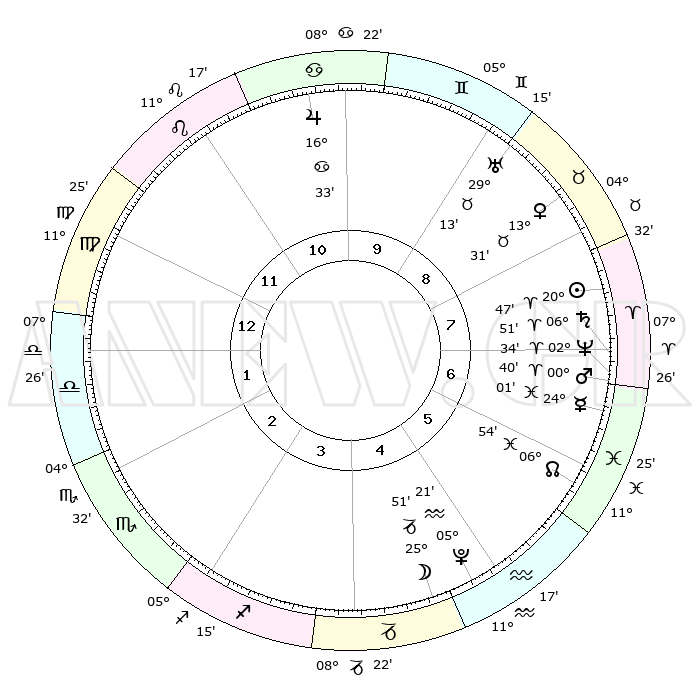 | | ΘΕΣΕΙΣ ΠΛΑΝΗΤΩΝ ΑΣΤΡΟΛΟΓΙΚΟΥ ΧΑΡΤΗ ΤΗΣ ΣΤΙΓΜΗΣ ΑΥΤΗΣ | | | | Πλανήτης | Ζώδιο | Μοίρες | Δεκαήμ. | Σε οίκο | Απόκλιση | | Ακμές των οίκων | | Ηλιος | Κριός | 20°44' | Τρίτο | 8 | 08 N 05 | | 1ος | 18°36' | Παρθένος | | Σελήνη | Αιγόκερως | 25°04' | Τρίτο | 5 | 24 S 35 | | 2ος | 14°16' | Ζυγός | | Ερμής | Ιχθείς | 23°56' | Τρίτο | 7 | 04 S 35 | | 3ος | 14°13' | Σκορπιός | | Αφροδίτη | Ταύρος | 13°26' | Δεύτερο | 8 | 15 N 50 | | 4ος | 17°09' | Τοξότης | | Αρης | Κριός | 00°37' | Πρώτο | 7 | 00 S 41 | | 5ος | 20°23' | Αιγόκερως | | Δίας | Καρκίνος | 16°32' | Δεύτερο | 10 | 22 N 47 | | 6ος | 21°15' | Υδροχόος | | Κρόνος | Κριός | 06°51' | Πρώτο | 7 | 00 N 45 | | 7ος | 18°36' | Ιχθείς | | Ουρανός | Ταύρος | 29°12' | Τρίτο | 9 | 19 N 49 | | 8ος | 14°16' | Κριός | | Ποσειδώνας | Κριός | 02°34' | Πρώτο | 7 | 00 S 11 | | 9ος | 14°13' | Ταύρος | | Πλούτωνας | Υδροχόος | 05°21' | Πρώτο | 5 | 22 S 47 | | 10ος | 17°09' | Δίδυμοι | | Β. Δεσμός | Ιχθείς | 06°54' | Πρώτο | 6 | 08 S 59 | | 11ος | 20°23' | Καρκίνος | | Ωροσκόπος | Παρθένος | 18°36' | Δεύτερο | | | 12ος | 21°15' | Λέων | | Μεσουράνημα | Δίδυμοι | 17°09' | Δεύτερο | | | |