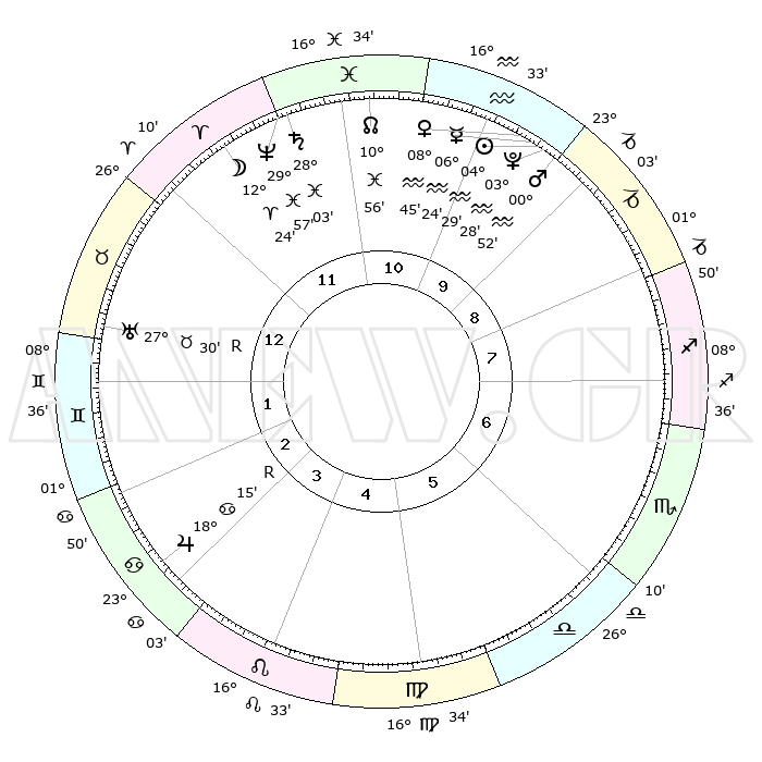 | | ΘΕΣΕΙΣ ΠΛΑΝΗΤΩΝ ΑΣΤΡΟΛΟΓΙΚΟΥ ΧΑΡΤΗ ΤΗΣ ΣΤΙΓΜΗΣ ΑΥΤΗΣ | | | | Πλανήτης | Ζώδιο | Μοίρες | Δεκαήμ. | Σε οίκο | Απόκλιση | | Ακμές των οίκων | | Ηλιος | Υδροχόος | 04°24' | Πρώτο | 10 | 19 S 09 | | 1ος | 00°00' | Ταύρος | | Σελήνη | Κριός | 11°16' | Δεύτερο | 12 | 06 N 59 | | 2ος | 02°13' | Δίδυμοι | | Ερμής | Υδροχόος | 06°15' | Πρώτο | 10 | 20 S 44 | | 3ος | 25°47' | Δίδυμοι | | Αφροδίτη | Υδροχόος | 08°38' | Πρώτο | 10 | 19 S 17 | | 4ος | 17°28' | Καρκίνος | | Αρης | Υδροχόος | 00°48' | Πρώτο | 10 | 20 S 58 | | 5ος | 11°52' | Λέων | | Δίας | Καρκίνος | 18°15'R | Δεύτερο | 4 | 22 N 29 | | 6ος | 14°35' | Παρθένος | | Κρόνος | Ιχθείς | 28°02' | Τρίτο | 12 | 02 S 47 | | 7ος | 00°00' | Σκορπιός | | Ουρανός | Ταύρος | 27°30'R | Τρίτο | 1 | 19 N 25 | | 8ος | 02°13' | Τοξότης | | Ποσειδώνας | Ιχθείς | 29°57' | Τρίτο | 12 | 01 S 14 | | 9ος | 25°47' | Τοξότης | | Πλούτωνας | Υδροχόος | 03°27' | Πρώτο | 10 | 23 S 04 | | 10ος | 17°28' | Αιγόκερως | | Β. Δεσμός | Ιχθείς | 10°56' | Δεύτερο | 11 | 07 S 28 | | 11ος | 11°52' | Υδροχόος | | Ωροσκόπος | Ταύρος | 00°00' | Πρώτο | | | 12ος | 14°35' | Ιχθείς | | Μεσουράνημα | Αιγόκερως | 17°28' | Δεύτερο | | | |