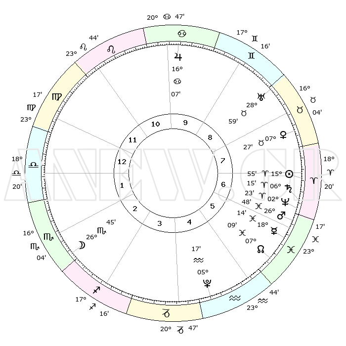 | | ΘΕΣΕΙΣ ΠΛΑΝΗΤΩΝ ΑΣΤΡΟΛΟΓΙΚΟΥ ΧΑΡΤΗ ΤΗΣ ΣΤΙΓΜΗΣ ΑΥΤΗΣ | | | | Πλανήτης | Ζώδιο | Μοίρες | Δεκαήμ. | Σε οίκο | Απόκλιση | | Ακμές των οίκων | | Ηλιος | Κριός | 15°47' | Δεύτερο | 8 | 06 N 13 | | 1ος | 06°51' | Παρθένος | | Σελήνη | Σκορπιός | 25°03' | Τρίτο | 3 | 23 S 54 | | 2ος | 01°25' | Ζυγός | | Ερμής | Ιχθείς | 18°05' | Δεύτερο | 7 | 06 S 29 | | 3ος | 00°39' | Σκορπιός | | Αφροδίτη | Ταύρος | 07°16' | Πρώτο | 9 | 13 N 42 | | 4ος | 03°36' | Τοξότης | | Αρης | Ιχθείς | 26°42' | Τρίτο | 7 | 02 S 15 | | 5ος | 07°21' | Αιγόκερως | | Δίας | Καρκίνος | 16°07' | Δεύτερο | 11 | 22 N 50 | | 6ος | 08°50' | Υδροχόος | | Κρόνος | Κριός | 06°14' | Πρώτο | 8 | 00 N 31 | | 7ος | 06°51' | Ιχθείς | | Ουρανός | Ταύρος | 28°58' | Τρίτο | 9 | 19 N 45 | | 8ος | 01°25' | Κριός | | Ποσειδώνας | Κριός | 02°23' | Πρώτο | 8 | 00 S 15 | | 9ος | 00°39' | Ταύρος | | Πλούτωνας | Υδροχόος | 05°17' | Πρώτο | 5 | 22 S 47 | | 10ος | 03°36' | Δίδυμοι | | Β. Δεσμός | Ιχθείς | 07°10' | Πρώτο | 7 | 08 S 53 | | 11ος | 07°21' | Καρκίνος | | Ωροσκόπος | Παρθένος | 06°51' | Πρώτο | | | 12ος | 08°50' | Λέων | | Μεσουράνημα | Δίδυμοι | 03°36' | Πρώτο | | | |
