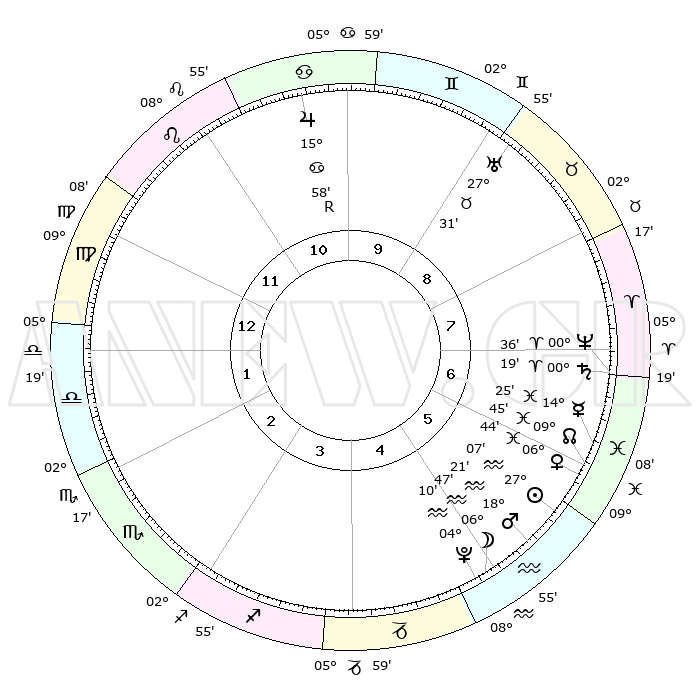 | | ΘΕΣΕΙΣ ΠΛΑΝΗΤΩΝ ΑΣΤΡΟΛΟΓΙΚΟΥ ΧΑΡΤΗ ΤΗΣ ΣΤΙΓΜΗΣ ΑΥΤΗΣ | | | | Πλανήτης | Ζώδιο | Μοίρες | Δεκαήμ. | Σε οίκο | Απόκλιση | | Ακμές των οίκων | | Ηλιος | Υδροχόος | 27°03' | Τρίτο | 6 | 12 S 29 | | 1ος | 18°20' | Παρθένος | | Σελήνη | Υδροχόος | 06°03' | Πρώτο | 5 | 21 S 32 | | 2ος | 13°59' | Ζυγός | | Ερμής | Ιχθείς | 14°20' | Δεύτερο | 6 | 05 S 58 | | 3ος | 13°55' | Σκορπιός | | Αφροδίτη | Ιχθείς | 06°40' | Πρώτο | 6 | 10 S 26 | | 4ος | 16°50' | Τοξότης | | Αρης | Υδροχόος | 18°19' | Δεύτερο | 5 | 16 S 22 | | 5ος | 20°05' | Αιγόκερως | | Δίας | Καρκίνος | 15°58'R | Δεύτερο | 10 | 22 N 48 | | 6ος | 20°58' | Υδροχόος | | Κρόνος | Κριός | 00°18' | Πρώτο | 7 | 01 S 51 | | 7ος | 18°20' | Ιχθείς | | Ουρανός | Ταύρος | 27°31' | Τρίτο | 9 | 19 N 25 | | 8ος | 13°59' | Κριός | | Ποσειδώνας | Κριός | 00°35' | Πρώτο | 7 | 00 S 58 | | 9ος | 13°55' | Ταύρος | | Πλούτωνας | Υδροχόος | 04°09' | Πρώτο | 5 | 22 S 56 | | 10ος | 16°50' | Δίδυμοι | | Β. Δεσμός | Ιχθείς | 09°45' | Πρώτο | 6 | 07 S 55 | | 11ος | 20°05' | Καρκίνος | | Ωροσκόπος | Παρθένος | 18°20' | Δεύτερο | | | 12ος | 20°58' | Λέων | | Μεσουράνημα | Δίδυμοι | 16°50' | Δεύτερο | | | |