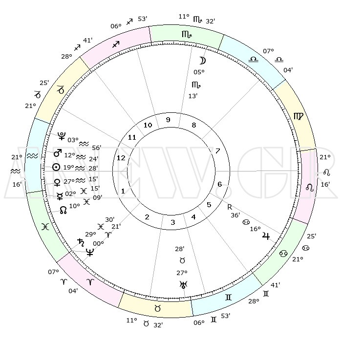 | | ΘΕΣΕΙΣ ΠΛΑΝΗΤΩΝ ΑΣΤΡΟΛΟΓΙΚΟΥ ΧΑΡΤΗ ΤΗΣ ΣΤΙΓΜΗΣ ΑΥΤΗΣ | | | | Πλανήτης | Ζώδιο | Μοίρες | Δεκαήμ. | Σε οίκο | Απόκλιση | | Ακμές των οίκων | | Ηλιος | Υδροχόος | 19°23' | Δεύτερο | 1 | 15 S 00 | | 1ος | 17°22' | Αιγόκερως | | Σελήνη | Σκορπιός | 04°17' | Πρώτο | 9 | 17 S 00 | | 2ος | 28°54' | Υδροχόος | | Ερμής | Ιχθείς | 02°07' | Πρώτο | 2 | 11 S 49 | | 3ος | 08°51' | Κριός | | Αφροδίτη | Υδροχόος | 27°10' | Τρίτο | 1 | 13 S 48 | | 4ος | 09°38' | Ταύρος | | Αρης | Υδροχόος | 12°21' | Δεύτερο | 1 | 18 S 07 | | 5ος | 03°34' | Δίδυμοι | | Δίας | Καρκίνος | 16°37'R | Δεύτερο | 6 | 22 N 43 | | 6ος | 24°46' | Δίδυμοι | | Κρόνος | Ιχθείς | 29°29' | Τρίτο | 2 | 02 S 11 | | 7ος | 17°22' | Καρκίνος | | Ουρανός | Ταύρος | 27°28' | Τρίτο | 4 | 19 N 24 | | 8ος | 28°54' | Λέων | | Ποσειδώνας | Κριός | 00°21' | Πρώτο | 2 | 01 S 04 | | 9ος | 08°51' | Ζυγός | | Πλούτωνας | Υδροχόος | 03°56' | Πρώτο | 1 | 22 S 59 | | 10ος | 09°38' | Σκορπιός | | Β. Δεσμός | Ιχθείς | 10°09' | Δεύτερο | 2 | 07 S 46 | | 11ος | 03°34' | Τοξότης | | Ωροσκόπος | Αιγόκερως | 17°22' | Δεύτερο | | | 12ος | 24°46' | Τοξότης | | Μεσουράνημα | Σκορπιός | 09°38' | Πρώτο | | | |