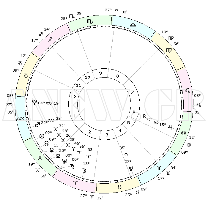 | | ΘΕΣΕΙΣ ΠΛΑΝΗΤΩΝ ΑΣΤΡΟΛΟΓΙΚΟΥ ΧΑΡΤΗ ΤΗΣ ΣΤΙΓΜΗΣ ΑΥΤΗΣ | | | | Πλανήτης | Ζώδιο | Μοίρες | Δεκαήμ. | Σε οίκο | Απόκλιση | | Ακμές των οίκων | | Ηλιος | Ιχθείς | 02°28' | Πρώτο | 2 | 10 S 36 | | 1ος | 10°29' | Αιγόκερως | | Σελήνη | Κριός | 17°41' | Δεύτερο | 3 | 10 N 00 | | 2ος | 20°19' | Υδροχόος | | Ερμής | Ιχθείς | 20°24' | Τρίτο | 2 | 02 S 24 | | 3ος | 00°36' | Κριός | | Αφροδίτη | Ιχθείς | 13°22' | Δεύτερο | 2 | 07 S 52 | | 4ος | 02°41' | Ταύρος | | Αρης | Υδροχόος | 22°32' | Τρίτο | 2 | 15 S 02 | | 5ος | 27°28' | Ταύρος | | Δίας | Καρκίνος | 15°37'R | Δεύτερο | 7 | 22 N 51 | | 6ος | 18°47' | Δίδυμοι | | Κρόνος | Κριός | 00°55' | Πρώτο | 3 | 01 S 36 | | 7ος | 10°29' | Καρκίνος | | Ουρανός | Ταύρος | 27°35' | Τρίτο | 5 | 19 N 26 | | 8ος | 20°19' | Λέων | | Ποσειδώνας | Κριός | 00°46' | Πρώτο | 3 | 00 S 54 | | 9ος | 00°36' | Ζυγός | | Πλούτωνας | Υδροχόος | 04°19' | Πρώτο | 1 | 22 S 55 | | 10ος | 02°41' | Σκορπιός | | Β. Δεσμός | Ιχθείς | 09°28' | Πρώτο | 2 | 08 S 01 | | 11ος | 27°28' | Σκορπιός | | Ωροσκόπος | Αιγόκερως | 10°29' | Δεύτερο | | | 12ος | 18°47' | Τοξότης | | Μεσουράνημα | Σκορπιός | 02°41' | Πρώτο | | | |