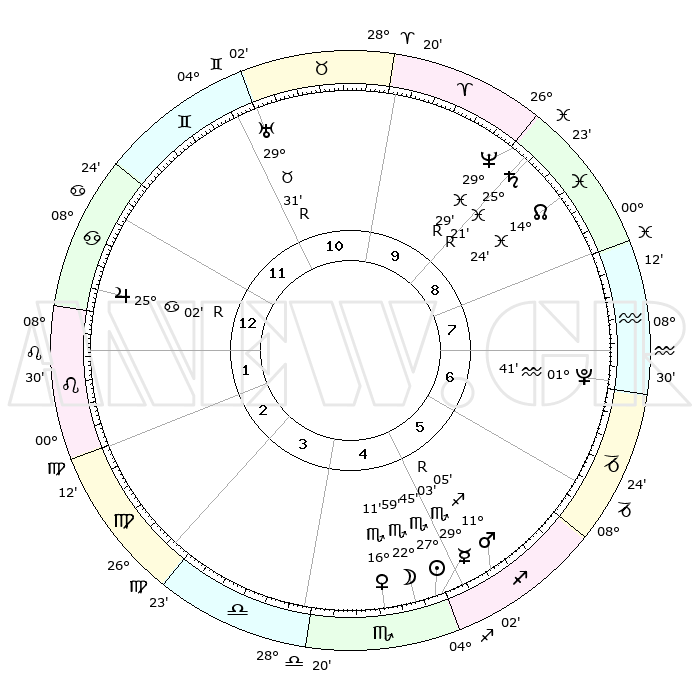| | ΘΕΣΕΙΣ ΠΛΑΝΗΤΩΝ ΑΣΤΡΟΛΟΓΙΚΟΥ ΧΑΡΤΗ ΤΗΣ ΣΤΙΓΜΗΣ ΑΥΤΗΣ | | | | Πλανήτης | Ζώδιο | Μοίρες | Δεκαήμ. | Σε οίκο | Απόκλιση | | Ακμές των οίκων | | Ηλιος | Σκορπιός | 27°42' | Τρίτο | 5 | 19 S 38 | | 1ος | 21°11' | Καρκίνος | | Σελήνη | Σκορπιός | 22°17' | Τρίτο | 5 | 22 S 47 | | 2ος | 11°46' | Λέων | | Ερμής | Σκορπιός | 29°08'R | Τρίτο | 5 | 19 S 38 | | 3ος | 05°40' | Παρθένος | | Αφροδίτη | Σκορπιός | 16°07' | Δεύτερο | 5 | 15 S 38 | | 4ος | 05°28' | Ζυγός | | Αρης | Τοξότης | 11°03' | Δεύτερο | 5 | 22 S 39 | | 5ος | 11°29' | Σκορπιός | | Δίας | Καρκίνος | 25°02'R | Τρίτο | 1 | 21 N 15 | | 6ος | 18°41' | Τοξότης | | Κρόνος | Ιχθείς | 25°21'R | Τρίτο | 9 | 04 S 04 | | 7ος | 21°11' | Αιγόκερως | | Ουρανός | Ταύρος | 29°31'R | Τρίτο | 11 | 19 N 50 | | 8ος | 11°46' | Υδροχόος | | Ποσειδώνας | Ιχθείς | 29°29'R | Τρίτο | 9 | 01 S 27 | | 9ος | 05°40' | Ιχθείς | | Πλούτωνας | Υδροχόος | 01°41' | Πρώτο | 7 | 23 S 27 | | 10ος | 05°28' | Κριός | | Β. Δεσμός | Ιχθείς | 14°24' | Δεύτερο | 9 | 06 S 08 | | 11ος | 11°29' | Ταύρος | | Ωροσκόπος | Καρκίνος | 21°11' | Τρίτο | | | 12ος | 18°41' | Δίδυμοι | | Μεσουράνημα | Κριός | 05°28' | Πρώτο | | | |