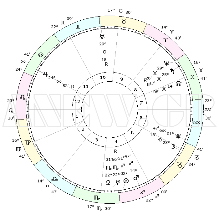 | | ΘΕΣΕΙΣ ΠΛΑΝΗΤΩΝ ΑΣΤΡΟΛΟΓΙΚΟΥ ΧΑΡΤΗ ΤΗΣ ΣΤΙΓΜΗΣ ΑΥΤΗΣ | | | | Πλανήτης | Ζώδιο | Μοίρες | Δεκαήμ. | Σε οίκο | Απόκλιση | | Ακμές των οίκων | | Ηλιος | Τοξότης | 02°48' | Πρώτο | 4 | 20 S 43 | | 1ος | 08°14' | Λέων | | Σελήνη | Αιγόκερως | 22°40' | Τρίτο | 6 | 25 S 25 | | 2ος | 29°54' | Λέων | | Ερμής | Σκορπιός | 22°58'R | Τρίτο | 4 | 16 S 44 | | 3ος | 26°04' | Παρθένος | | Αφροδίτη | Σκορπιός | 22°27' | Τρίτο | 4 | 17 S 29 | | 4ος | 27°59' | Ζυγός | | Αρης | Τοξότης | 14°45' | Δεύτερο | 5 | 23 S 10 | | 5ος | 03°41' | Τοξότης | | Δίας | Καρκίνος | 24°52'R | Τρίτο | 12 | 21 N 17 | | 6ος | 08°06' | Αιγόκερως | | Κρόνος | Ιχθείς | 25°18'R | Τρίτο | 8 | 04 S 04 | | 7ος | 08°14' | Υδροχόος | | Ουρανός | Ταύρος | 29°18'R | Τρίτο | 10 | 19 N 48 | | 8ος | 29°54' | Υδροχόος | | Ποσειδώνας | Ιχθείς | 29°26'R | Τρίτο | 9 | 01 S 28 | | 9ος | 26°04' | Ιχθείς | | Πλούτωνας | Υδροχόος | 01°47' | Πρώτο | 6 | 23 S 26 | | 10ος | 27°59' | Κριός | | Β. Δεσμός | Ιχθείς | 14°08' | Δεύτερο | 8 | 06 S 14 | | 11ος | 03°41' | Δίδυμοι | | Ωροσκόπος | Λέων | 08°14' | Πρώτο | | | 12ος | 08°06' | Καρκίνος | | Μεσουράνημα | Κριός | 27°59' | Τρίτο | | | |