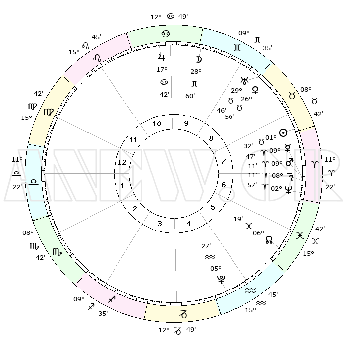 | | ΘΕΣΕΙΣ ΠΛΑΝΗΤΩΝ ΑΣΤΡΟΛΟΓΙΚΟΥ ΧΑΡΤΗ ΤΗΣ ΣΤΙΓΜΗΣ ΑΥΤΗΣ | | | | Πλανήτης | Ζώδιο | Μοίρες | Δεκαήμ. | Σε οίκο | Απόκλιση | | Ακμές των οίκων | | Ηλιος | Ταύρος | 01°27' | Πρώτο | 8 | 11 N 59 | | 1ος | 16°24' | Παρθένος | | Σελήνη | Δίδυμοι | 27°46' | Τρίτο | 10 | 28 N 12 | | 2ος | 11°53' | Ζυγός | | Ερμής | Κριός | 09°39' | Πρώτο | 7 | 01 N 27 | | 3ος | 11°43' | Σκορπιός | | Αφροδίτη | Ταύρος | 26°50' | Τρίτο | 9 | 19 N 54 | | 4ος | 14°39' | Τοξότης | | Αρης | Κριός | 09°07' | Πρώτο | 7 | 02 N 45 | | 5ος | 17°57' | Αιγόκερως | | Δίας | Καρκίνος | 17°42' | Δεύτερο | 10 | 22 N 39 | | 6ος | 18°56' | Υδροχόος | | Κρόνος | Κριός | 08°10' | Πρώτο | 7 | 01 N 16 | | 7ος | 16°24' | Ιχθείς | | Ουρανός | Ταύρος | 29°46' | Τρίτο | 9 | 19 N 56 | | 8ος | 11°53' | Κριός | | Ποσειδώνας | Κριός | 02°57' | Πρώτο | 7 | 00 S 02 | | 9ος | 11°43' | Ταύρος | | Πλούτωνας | Υδροχόος | 05°27' | Πρώτο | 5 | 22 S 48 | | 10ος | 14°39' | Δίδυμοι | | Β. Δεσμός | Ιχθείς | 06°19' | Πρώτο | 6 | 09 S 12 | | 11ος | 17°57' | Καρκίνος | | Ωροσκόπος | Παρθένος | 16°24' | Δεύτερο | | | 12ος | 18°56' | Λέων | | Μεσουράνημα | Δίδυμοι | 14°39' | Δεύτερο | | | |