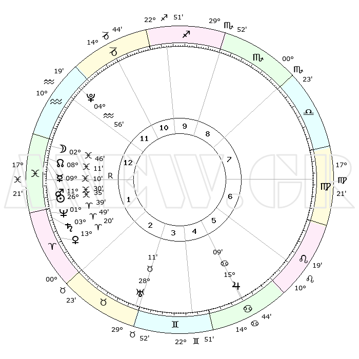 | | ΘΕΣΕΙΣ ΠΛΑΝΗΤΩΝ ΑΣΤΡΟΛΟΓΙΚΟΥ ΧΑΡΤΗ ΤΗΣ ΣΤΙΓΜΗΣ ΑΥΤΗΣ | | | | Πλανήτης | Ζώδιο | Μοίρες | Δεκαήμ. | Σε οίκο | Απόκλιση | | Ακμές των οίκων | | Ηλιος | Ιχθείς | 26°28' | Τρίτο | 2 | 01 S 24 | | 1ος | 16°11' | Αιγόκερως | | Σελήνη | Ιχθείς | 01°04' | Πρώτο | 2 | 11 S 47 | | 2ος | 27°25' | Υδροχόος | | Ερμής | Ιχθείς | 09°13'R | Πρώτο | 2 | 06 S 20 | | 3ος | 07°28' | Κριός | | Αφροδίτη | Κριός | 13°11' | Δεύτερο | 3 | 04 N 18 | | 4ος | 08°28' | Ταύρος | | Αρης | Ιχθείς | 11°24' | Δεύτερο | 2 | 08 S 17 | | 5ος | 02°32' | Δίδυμοι | | Δίας | Καρκίνος | 15°09' | Δεύτερο | 6 | 22 N 56 | | 6ος | 23°45' | Δίδυμοι | | Κρόνος | Κριός | 03°48' | Πρώτο | 2 | 00 S 26 | | 7ος | 16°11' | Καρκίνος | | Ουρανός | Ταύρος | 28°11' | Τρίτο | 4 | 19 N 35 | | 8ος | 27°25' | Λέων | | Ποσειδώνας | Κριός | 01°39' | Πρώτο | 2 | 00 S 33 | | 9ος | 07°28' | Ζυγός | | Πλούτωνας | Υδροχόος | 04°56' | Πρώτο | 1 | 22 S 49 | | 10ος | 08°28' | Σκορπιός | | Β. Δεσμός | Ιχθείς | 08°12' | Πρώτο | 2 | 08 S 30 | | 11ος | 02°32' | Τοξότης | | Ωροσκόπος | Αιγόκερως | 16°11' | Δεύτερο | | | 12ος | 23°45' | Τοξότης | | Μεσουράνημα | Σκορπιός | 08°28' | Πρώτο | | | |