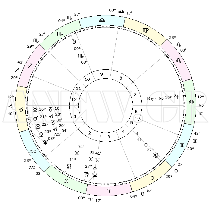 | | ΘΕΣΕΙΣ ΠΛΑΝΗΤΩΝ ΑΣΤΡΟΛΟΓΙΚΟΥ ΧΑΡΤΗ ΤΗΣ ΣΤΙΓΜΗΣ ΑΥΤΗΣ | | | | Πλανήτης | Ζώδιο | Μοίρες | Δεκαήμ. | Σε οίκο | Απόκλιση | | Ακμές των οίκων | | Ηλιος | Αιγόκερως | 21°56' | Τρίτο | 1 | 21 S 39 | | 1ος | 18°48' | Τοξότης | | Σελήνη | Σκορπιός | 08°12' | Πρώτο | 11 | 18 S 21 | | 2ος | 23°18' | Αιγόκερως | | Ερμής | Αιγόκερως | 16°03' | Δεύτερο | 1 | 24 S 03 | | 3ος | 02°04' | Ιχθείς | | Αφροδίτη | Αιγόκερως | 23°14' | Τρίτο | 1 | 22 S 19 | | 4ος | 07°28' | Κριός | | Αρης | Αιγόκερως | 21°17' | Τρίτο | 1 | 22 S 42 | | 5ος | 05°38' | Ταύρος | | Δίας | Καρκίνος | 19°52'R | Δεύτερο | 7 | 22 N 14 | | 6ος | 28°23' | Ταύρος | | Κρόνος | Ιχθείς | 27°02' | Τρίτο | 3 | 03 S 13 | | 7ος | 18°48' | Δίδυμοι | | Ουρανός | Ταύρος | 27°41'R | Τρίτο | 5 | 19 N 27 | | 8ος | 23°18' | Καρκίνος | | Ποσειδώνας | Ιχθείς | 29°41' | Τρίτο | 3 | 01 S 21 | | 9ος | 02°04' | Παρθένος | | Πλούτωνας | Υδροχόος | 03°04' | Πρώτο | 2 | 23 S 09 | | 10ος | 07°28' | Ζυγός | | Β. Δεσμός | Ιχθείς | 11°35' | Δεύτερο | 3 | 07 S 13 | | 11ος | 05°38' | Σκορπιός | | Ωροσκόπος | Τοξότης | 18°48' | Δεύτερο | | | 12ος | 28°23' | Σκορπιός | | Μεσουράνημα | Ζυγός | 07°28' | Πρώτο | | | |