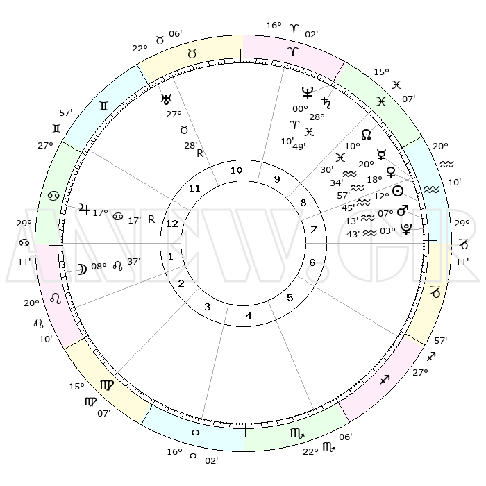 | | ΘΕΣΕΙΣ ΠΛΑΝΗΤΩΝ ΑΣΤΡΟΛΟΓΙΚΟΥ ΧΑΡΤΗ ΤΗΣ ΣΤΙΓΜΗΣ ΑΥΤΗΣ | | | | Πλανήτης | Ζώδιο | Μοίρες | Δεκαήμ. | Σε οίκο | Απόκλιση | | Ακμές των οίκων | | Ηλιος | Υδροχόος | 12°41' | Δεύτερο | 8 | 17 S 00 | | 1ος | 12°46' | Καρκίνος | | Σελήνη | Λέων | 07°50' | Πρώτο | 2 | 20 N 56 | | 2ος | 03°11' | Λέων | | Ερμής | Υδροχόος | 20°28' | Τρίτο | 8 | 16 S 25 | | 3ος | 26°05' | Λέων | | Αφροδίτη | Υδροχόος | 18°53' | Δεύτερο | 8 | 16 S 28 | | 4ος | 24°31' | Παρθένος | | Αρης | Υδροχόος | 07°10' | Πρώτο | 8 | 19 S 29 | | 5ος | 00°04' | Σκορπιός | | Δίας | Καρκίνος | 17°18'R | Δεύτερο | 1 | 22 N 37 | | 6ος | 08°37' | Τοξότης | | Κρόνος | Ιχθείς | 28°49' | Τρίτο | 10 | 02 S 28 | | 7ος | 12°46' | Αιγόκερως | | Ουρανός | Ταύρος | 27°28'R | Τρίτο | 11 | 19 N 24 | | 8ος | 03°11' | Υδροχόος | | Ποσειδώνας | Κριός | 00°10' | Πρώτο | 10 | 01 S 09 | | 9ος | 26°05' | Υδροχόος | | Πλούτωνας | Υδροχόος | 03°43' | Πρώτο | 8 | 23 S 01 | | 10ος | 24°31' | Ιχθείς | | Β. Δεσμός | Ιχθείς | 10°30' | Δεύτερο | 9 | 07 S 38 | | 11ος | 00°04' | Ταύρος | | Ωροσκόπος | Καρκίνος | 12°46' | Δεύτερο | | | 12ος | 08°37' | Δίδυμοι | | Μεσουράνημα | Ιχθείς | 24°31' | Τρίτο | | | |