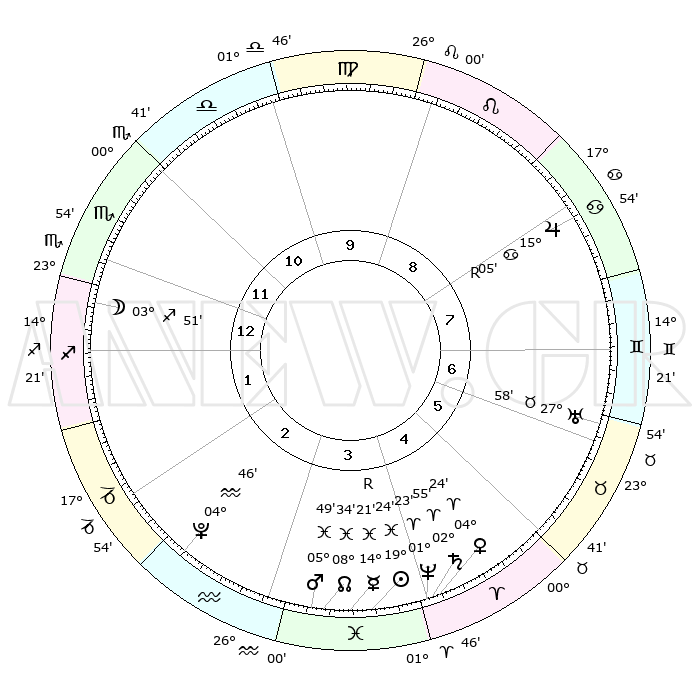 | | ΘΕΣΕΙΣ ΠΛΑΝΗΤΩΝ ΑΣΤΡΟΛΟΓΙΚΟΥ ΧΑΡΤΗ ΤΗΣ ΣΤΙΓΜΗΣ ΑΥΤΗΣ | | | | Πλανήτης | Ζώδιο | Μοίρες | Δεκαήμ. | Σε οίκο | Απόκλιση | | Ακμές των οίκων | | Ηλιος | Ιχθείς | 19°20' | Δεύτερο | 4 | 04 S 13 | | 1ος | 26°50' | Σκορπιός | | Σελήνη | Τοξότης | 03°09' | Πρώτο | 1 | 25 S 56 | | 2ος | 27°33' | Τοξότης | | Ερμής | Ιχθείς | 14°25'R | Δεύτερο | 4 | 03 S 00 | | 3ος | 02°45' | Υδροχόος | | Αφροδίτη | Κριός | 04°19' | Πρώτο | 4 | 00 N 38 | | 4ος | 08°42' | Ιχθείς | | Αρης | Ιχθείς | 05°47' | Πρώτο | 3 | 10 S 24 | | 5ος | 10°06' | Κριός | | Δίας | Καρκίνος | 15°05'R | Δεύτερο | 8 | 22 N 56 | | 6ος | 05°35' | Ταύρος | | Κρόνος | Κριός | 02°55' | Πρώτο | 4 | 00 S 48 | | 7ος | 26°50' | Ταύρος | | Ουρανός | Ταύρος | 27°57' | Τρίτο | 7 | 19 N 32 | | 8ος | 27°33' | Δίδυμοι | | Ποσειδώνας | Κριός | 01°23' | Πρώτο | 4 | 00 S 39 | | 9ος | 02°45' | Λέων | | Πλούτωνας | Υδροχόος | 04°46' | Πρώτο | 3 | 22 S 50 | | 10ος | 08°42' | Παρθένος | | Β. Δεσμός | Ιχθείς | 08°34' | Πρώτο | 3 | 08 S 21 | | 11ος | 10°06' | Ζυγός | | Ωροσκόπος | Σκορπιός | 26°50' | Τρίτο | | | 12ος | 05°35' | Σκορπιός | | Μεσουράνημα | Παρθένος | 08°42' | Πρώτο | | | |