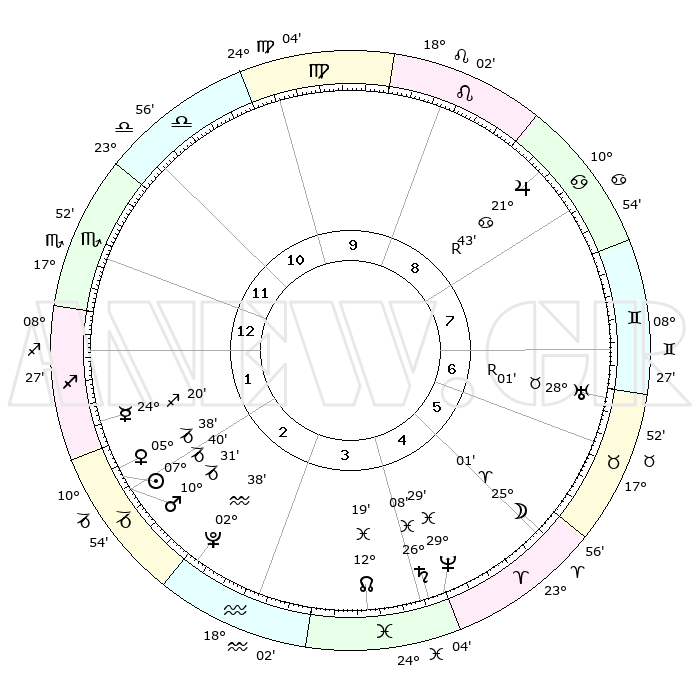 | | ΘΕΣΕΙΣ ΠΛΑΝΗΤΩΝ ΑΣΤΡΟΛΟΓΙΚΟΥ ΧΑΡΤΗ ΤΗΣ ΣΤΙΓΜΗΣ ΑΥΤΗΣ | | | | Πλανήτης | Ζώδιο | Μοίρες | Δεκαήμ. | Σε οίκο | Απόκλιση | | Ακμές των οίκων | | Ηλιος | Αιγόκερως | 07°35' | Πρώτο | 2 | 23 S 13 | | 1ος | 17°32' | Σκορπιός | | Σελήνη | Κριός | 24°00' | Τρίτο | 5 | 12 N 31 | | 2ος | 17°15' | Τοξότης | | Ερμής | Τοξότης | 24°14' | Τρίτο | 2 | 23 S 33 | | 3ος | 21°04' | Αιγόκερως | | Αφροδίτη | Αιγόκερως | 05°32' | Πρώτο | 2 | 23 S 43 | | 4ος | 26°31' | Υδροχόος | | Αρης | Αιγόκερως | 10°28' | Δεύτερο | 2 | 23 S 53 | | 5ος | 28°46' | Ιχθείς | | Δίας | Καρκίνος | 21°44'R | Τρίτο | 9 | 21 N 54 | | 6ος | 25°29' | Κριός | | Κρόνος | Ιχθείς | 26°07' | Τρίτο | 4 | 03 S 37 | | 7ος | 17°32' | Ταύρος | | Ουρανός | Ταύρος | 28°02'R | Τρίτο | 7 | 19 N 31 | | 8ος | 17°15' | Δίδυμοι | | Ποσειδώνας | Ιχθείς | 29°28' | Τρίτο | 5 | 01 S 26 | | 9ος | 21°04' | Καρκίνος | | Πλούτωνας | Υδροχόος | 02°38' | Πρώτο | 3 | 23 S 14 | | 10ος | 26°31' | Λέων | | Β. Δεσμός | Ιχθείς | 12°19' | Δεύτερο | 4 | 06 S 56 | | 11ος | 28°46' | Παρθένος | | Ωροσκόπος | Σκορπιός | 17°32' | Δεύτερο | | | 12ος | 25°29' | Ζυγός | | Μεσουράνημα | Λέων | 26°31' | Τρίτο | | | |