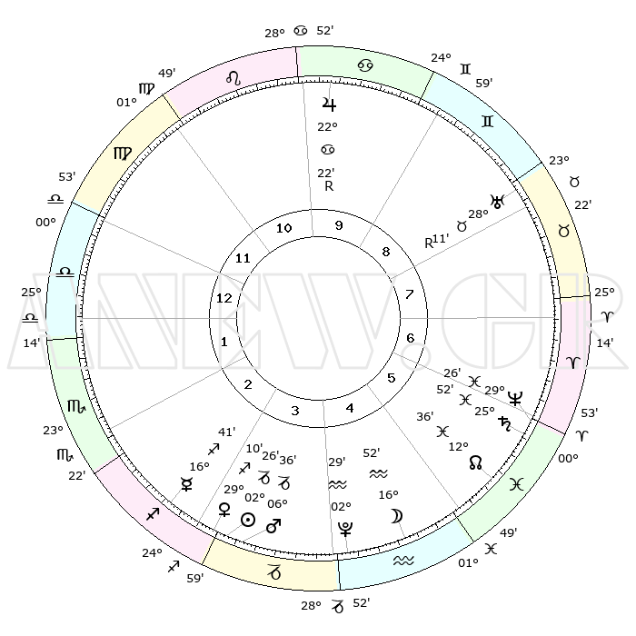 | | ΘΕΣΕΙΣ ΠΛΑΝΗΤΩΝ ΑΣΤΡΟΛΟΓΙΚΟΥ ΧΑΡΤΗ ΤΗΣ ΣΤΙΓΜΗΣ ΑΥΤΗΣ | | | | Πλανήτης | Ζώδιο | Μοίρες | Δεκαήμ. | Σε οίκο | Απόκλιση | | Ακμές των οίκων | | Ηλιος | Αιγόκερως | 02°21' | Πρώτο | 4 | 23 S 25 | | 1ος | 01°46' | Ζυγός | | Σελήνη | Υδροχόος | 15°52' | Δεύτερο | 5 | 18 S 09 | | 2ος | 28°29' | Ζυγός | | Ερμής | Τοξότης | 16°34' | Δεύτερο | 3 | 22 S 22 | | 3ος | 28°59' | Σκορπιός | | Αφροδίτη | Τοξότης | 29°04' | Τρίτο | 3 | 23 S 37 | | 4ος | 01°59' | Αιγόκερως | | Αρης | Αιγόκερως | 06°32' | Πρώτο | 4 | 24 S 06 | | 5ος | 04°57' | Υδροχόος | | Δίας | Καρκίνος | 22°22'R | Τρίτο | 10 | 21 N 48 | | 6ος | 05°19' | Ιχθείς | | Κρόνος | Ιχθείς | 25°52' | Τρίτο | 6 | 03 S 44 | | 7ος | 01°46' | Κριός | | Ουρανός | Ταύρος | 28°11'R | Τρίτο | 8 | 19 N 33 | | 8ος | 28°29' | Κριός | | Ποσειδώνας | Ιχθείς | 29°26' | Τρίτο | 6 | 01 S 27 | | 9ος | 28°59' | Ταύρος | | Πλούτωνας | Υδροχόος | 02°29' | Πρώτο | 4 | 23 S 16 | | 10ος | 01°59' | Καρκίνος | | Β. Δεσμός | Ιχθείς | 12°36' | Δεύτερο | 6 | 06 S 50 | | 11ος | 04°57' | Λέων | | Ωροσκόπος | Ζυγός | 01°46' | Πρώτο | | | 12ος | 05°19' | Παρθένος | | Μεσουράνημα | Καρκίνος | 01°59' | Πρώτο | | | |