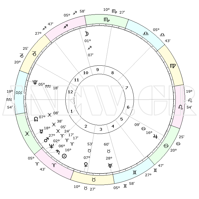 | | ΘΕΣΕΙΣ ΠΛΑΝΗΤΩΝ ΑΣΤΡΟΛΟΓΙΚΟΥ ΧΑΡΤΗ ΤΗΣ ΣΤΙΓΜΗΣ ΑΥΤΗΣ | | | | Πλανήτης | Ζώδιο | Μοίρες | Δεκαήμ. | Σε οίκο | Απόκλιση | | Ακμές των οίκων | | Ηλιος | Κριός | 16°13' | Δεύτερο | 3 | 06 N 23 | | 1ος | 22°15' | Αιγόκερως | | Σελήνη | Τοξότης | 00°22' | Πρώτο | 10 | 25 S 13 | | 2ος | 04°52' | Ιχθείς | | Ερμής | Ιχθείς | 18°34' | Δεύτερο | 2 | 06 S 20 | | 3ος | 14°22' | Κριός | | Αφροδίτη | Ταύρος | 07°49' | Πρώτο | 3 | 13 N 54 | | 4ος | 14°14' | Ταύρος | | Αρης | Ιχθείς | 27°03' | Τρίτο | 2 | 02 S 07 | | 5ος | 07°39' | Δίδυμοι | | Δίας | Καρκίνος | 16°09' | Δεύτερο | 6 | 22 N 50 | | 6ος | 28°53' | Δίδυμοι | | Κρόνος | Κριός | 06°17' | Πρώτο | 2 | 00 N 32 | | 7ος | 22°15' | Καρκίνος | | Ουρανός | Ταύρος | 28°59' | Τρίτο | 4 | 19 N 46 | | 8ος | 04°52' | Παρθένος | | Ποσειδώνας | Κριός | 02°24' | Πρώτο | 2 | 00 S 15 | | 9ος | 14°22' | Ζυγός | | Πλούτωνας | Υδροχόος | 05°18' | Πρώτο | 1 | 22 S 47 | | 10ος | 14°14' | Σκορπιός | | Β. Δεσμός | Ιχθείς | 07°08' | Πρώτο | 2 | 08 S 53 | | 11ος | 07°39' | Τοξότης | | Ωροσκόπος | Αιγόκερως | 22°15' | Τρίτο | | | 12ος | 28°53' | Τοξότης | | Μεσουράνημα | Σκορπιός | 14°14' | Δεύτερο | | | |
