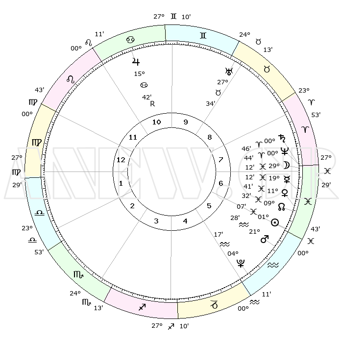 | | ΘΕΣΕΙΣ ΠΛΑΝΗΤΩΝ ΑΣΤΡΟΛΟΓΙΚΟΥ ΧΑΡΤΗ ΤΗΣ ΣΤΙΓΜΗΣ ΑΥΤΗΣ | | | | Πλανήτης | Ζώδιο | Μοίρες | Δεκαήμ. | Σε οίκο | Απόκλιση | | Ακμές των οίκων | | Ηλιος | Ιχθείς | 01°01' | Πρώτο | 6 | 11 S 06 | | 1ος | 01°11' | Παρθένος | | Σελήνη | Ιχθείς | 27°58' | Τρίτο | 8 | 00 N 47 | | 2ος | 25°10' | Παρθένος | | Ερμής | Ιχθείς | 19°07' | Δεύτερο | 7 | 03 S 14 | | 3ος | 23°57' | Ζυγός | | Αφροδίτη | Ιχθείς | 11°35' | Δεύτερο | 7 | 08 S 34 | | 4ος | 26°52' | Σκορπιός | | Αρης | Υδροχόος | 21°24' | Τρίτο | 6 | 15 S 24 | | 5ος | 00°59' | Αιγόκερως | | Δίας | Καρκίνος | 15°42'R | Δεύτερο | 11 | 22 N 50 | | 6ος | 02°51' | Υδροχόος | | Κρόνος | Κριός | 00°45' | Πρώτο | 8 | 01 S 40 | | 7ος | 01°11' | Ιχθείς | | Ουρανός | Ταύρος | 27°34' | Τρίτο | 10 | 19 N 26 | | 8ος | 25°10' | Ιχθείς | | Ποσειδώνας | Κριός | 00°43' | Πρώτο | 8 | 00 S 55 | | 9ος | 23°57' | Κριός | | Πλούτωνας | Υδροχόος | 04°16' | Πρώτο | 6 | 22 S 55 | | 10ος | 26°52' | Ταύρος | | Β. Δεσμός | Ιχθείς | 09°32' | Πρώτο | 7 | 07 S 59 | | 11ος | 00°59' | Καρκίνος | | Ωροσκόπος | Παρθένος | 01°11' | Πρώτο | | | 12ος | 02°51' | Λέων | | Μεσουράνημα | Ταύρος | 26°52' | Τρίτο | | | |