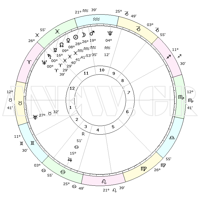 | | ΘΕΣΕΙΣ ΠΛΑΝΗΤΩΝ ΑΣΤΡΟΛΟΓΙΚΟΥ ΧΑΡΤΗ ΤΗΣ ΣΤΙΓΜΗΣ ΑΥΤΗΣ | | | | Πλανήτης | Ζώδιο | Μοίρες | Δεκαήμ. | Σε οίκο | Απόκλιση | | Ακμές των οίκων | | Ηλιος | Υδροχόος | 28°36' | Τρίτο | 12 | 11 S 57 | | 1ος | 00°21' | Κριός | | Σελήνη | Υδροχόος | 25°53' | Τρίτο | 12 | 14 S 01 | | 2ος | 10°34' | Ταύρος | | Ερμής | Ιχθείς | 16°23' | Δεύτερο | 12 | 04 S 51 | | 3ος | 07°55' | Δίδυμοι | | Αφροδίτη | Ιχθείς | 08°35' | Πρώτο | 12 | 09 S 42 | | 4ος | 00°12' | Καρκίνος | | Αρης | Υδροχόος | 19°31' | Δεύτερο | 11 | 15 S 59 | | 5ος | 22°31' | Καρκίνος | | Δίας | Καρκίνος | 15°52'R | Δεύτερο | 4 | 22 N 49 | | 6ος | 19°59' | Λέων | | Κρόνος | Κριός | 00°29' | Πρώτο | 1 | 01 S 47 | | 7ος | 00°21' | Ζυγός | | Ουρανός | Ταύρος | 27°32' | Τρίτο | 2 | 19 N 26 | | 8ος | 10°34' | Σκορπιός | | Ποσειδώνας | Κριός | 00°39' | Πρώτο | 1 | 00 S 57 | | 9ος | 07°55' | Τοξότης | | Πλούτωνας | Υδροχόος | 04°12' | Πρώτο | 11 | 22 S 56 | | 10ος | 00°12' | Αιγόκερως | | Β. Δεσμός | Ιχθείς | 09°40' | Πρώτο | 12 | 07 S 57 | | 11ος | 22°31' | Αιγόκερως | | Ωροσκόπος | Κριός | 00°21' | Πρώτο | | | 12ος | 19°59' | Υδροχόος | | Μεσουράνημα | Αιγόκερως | 00°12' | Πρώτο | | | |