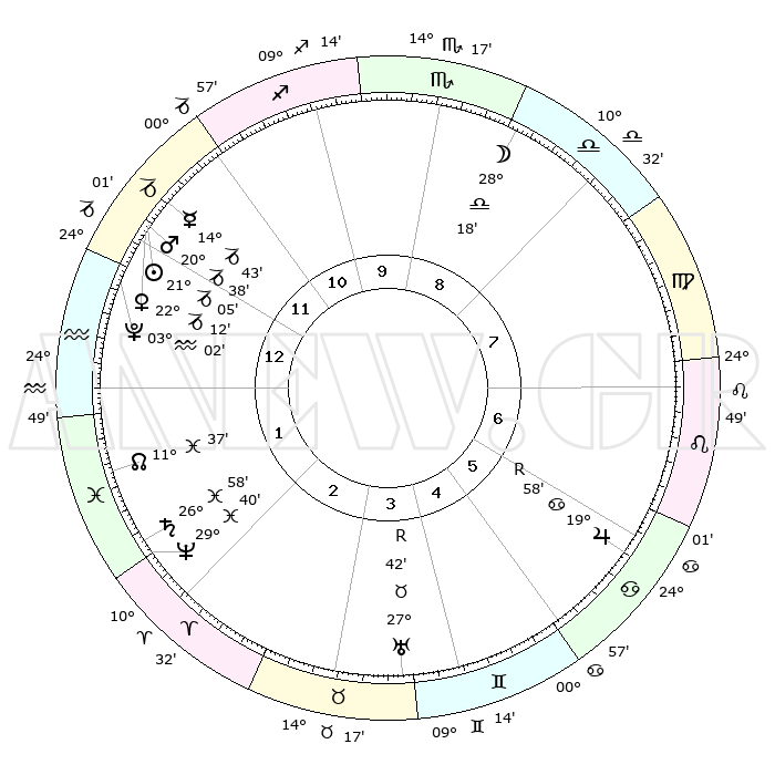 | | ΘΕΣΕΙΣ ΠΛΑΝΗΤΩΝ ΑΣΤΡΟΛΟΓΙΚΟΥ ΧΑΡΤΗ ΤΗΣ ΣΤΙΓΜΗΣ ΑΥΤΗΣ | | | | Πλανήτης | Ζώδιο | Μοίρες | Δεκαήμ. | Σε οίκο | Απόκλιση | | Ακμές των οίκων | | Ηλιος | Αιγόκερως | 20°36' | Τρίτο | 5 | 21 S 51 | | 1ος | 18°25' | Παρθένος | | Σελήνη | Ζυγός | 22°35' | Τρίτο | 2 | 11 S 59 | | 2ος | 14°05' | Ζυγός | | Ερμής | Αιγόκερως | 13°58' | Δεύτερο | 4 | 24 S 12 | | 3ος | 14°01' | Σκορπιός | | Αφροδίτη | Αιγόκερως | 21°36' | Τρίτο | 5 | 22 S 32 | | 4ος | 16°57' | Τοξότης | | Αρης | Αιγόκερως | 20°16' | Τρίτο | 5 | 22 S 51 | | 5ος | 20°11' | Αιγόκερως | | Δίας | Καρκίνος | 20°02'R | Τρίτο | 10 | 22 N 12 | | 6ος | 21°04' | Υδροχόος | | Κρόνος | Ιχθείς | 26°56' | Τρίτο | 7 | 03 S 16 | | 7ος | 18°25' | Ιχθείς | | Ουρανός | Ταύρος | 27°42'R | Τρίτο | 9 | 19 N 27 | | 8ος | 14°05' | Κριός | | Ποσειδώνας | Ιχθείς | 29°39' | Τρίτο | 7 | 01 S 21 | | 9ος | 14°01' | Ταύρος | | Πλούτωνας | Υδροχόος | 03°02' | Πρώτο | 5 | 23 S 09 | | 10ος | 16°57' | Δίδυμοι | | Β. Δεσμός | Ιχθείς | 11°39' | Δεύτερο | 6 | 07 S 12 | | 11ος | 20°11' | Καρκίνος | | Ωροσκόπος | Παρθένος | 18°25' | Δεύτερο | | | 12ος | 21°04' | Λέων | | Μεσουράνημα | Δίδυμοι | 16°57' | Δεύτερο | | | |