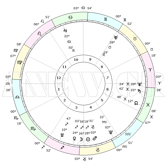 | | ΘΕΣΕΙΣ ΠΛΑΝΗΤΩΝ ΑΣΤΡΟΛΟΓΙΚΟΥ ΧΑΡΤΗ ΤΗΣ ΣΤΙΓΜΗΣ ΑΥΤΗΣ | | | | Πλανήτης | Ζώδιο | Μοίρες | Δεκαήμ. | Σε οίκο | Απόκλιση | | Ακμές των οίκων | | Ηλιος | Τοξότης | 28°13' | Τρίτο | 4 | 23 S 25 | | 1ος | 13°25' | Παρθένος | | Σελήνη | Τοξότης | 26°07' | Τρίτο | 4 | 28 S 14 | | 2ος | 08°37' | Ζυγός | | Ερμής | Τοξότης | 10°41' | Δεύτερο | 3 | 21 S 08 | | 3ος | 08°17' | Σκορπιός | | Αφροδίτη | Τοξότης | 23°58' | Τρίτο | 4 | 23 S 20 | | 4ος | 11°14' | Τοξότης | | Αρης | Αιγόκερως | 03°28' | Πρώτο | 4 | 24 S 12 | | 5ος | 14°40' | Αιγόκερως | | Δίας | Καρκίνος | 22°50'R | Τρίτο | 11 | 21 N 42 | | 6ος | 15°47' | Υδροχόος | | Κρόνος | Ιχθείς | 25°42' | Τρίτο | 7 | 03 S 49 | | 7ος | 13°25' | Ιχθείς | | Ουρανός | Ταύρος | 28°19'R | Τρίτο | 9 | 19 N 35 | | 8ος | 08°37' | Κριός | | Ποσειδώνας | Ιχθείς | 29°24' | Τρίτο | 7 | 01 S 28 | | 9ος | 08°17' | Ταύρος | | Πλούτωνας | Υδροχόος | 02°22' | Πρώτο | 5 | 23 S 18 | | 10ος | 11°14' | Δίδυμοι | | Β. Δεσμός | Ιχθείς | 12°49' | Δεύτερο | 6 | 06 S 45 | | 11ος | 14°40' | Καρκίνος | | Ωροσκόπος | Παρθένος | 13°25' | Δεύτερο | | | 12ος | 15°47' | Λέων | | Μεσουράνημα | Δίδυμοι | 11°14' | Δεύτερο | | | |