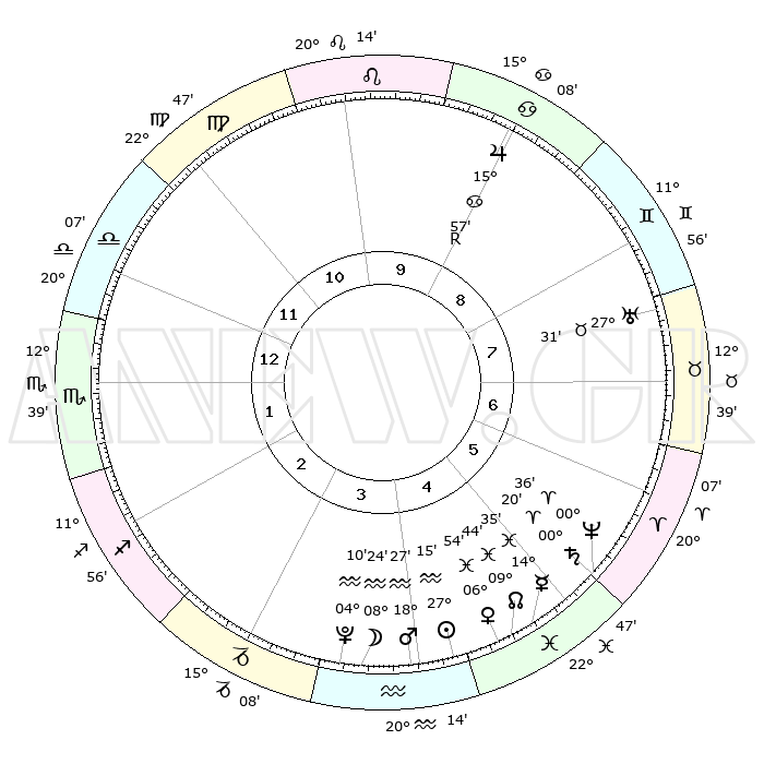 | | ΘΕΣΕΙΣ ΠΛΑΝΗΤΩΝ ΑΣΤΡΟΛΟΓΙΚΟΥ ΧΑΡΤΗ ΤΗΣ ΣΤΙΓΜΗΣ ΑΥΤΗΣ | | | | Πλανήτης | Ζώδιο | Μοίρες | Δεκαήμ. | Σε οίκο | Απόκλιση | | Ακμές των οίκων | | Ηλιος | Υδροχόος | 27°11' | Τρίτο | 4 | 12 S 27 | | 1ος | 25°18' | Ζυγός | | Σελήνη | Υδροχόος | 07°39' | Πρώτο | 4 | 21 S 00 | | 2ος | 23°26' | Σκορπιός | | Ερμής | Ιχθείς | 14°30' | Δεύτερο | 5 | 05 S 52 | | 3ος | 25°03' | Τοξότης | | Αφροδίτη | Ιχθείς | 06°49' | Πρώτο | 5 | 10 S 22 | | 4ος | 28°57' | Αιγόκερως | | Αρης | Υδροχόος | 18°24' | Δεύτερο | 4 | 16 S 20 | | 5ος | 01°54' | Ιχθείς | | Δίας | Καρκίνος | 15°58'R | Δεύτερο | 9 | 22 N 48 | | 6ος | 00°58' | Κριός | | Κρόνος | Κριός | 00°19' | Πρώτο | 5 | 01 S 51 | | 7ος | 25°18' | Κριός | | Ουρανός | Ταύρος | 27°31' | Τρίτο | 8 | 19 N 25 | | 8ος | 23°26' | Ταύρος | | Ποσειδώνας | Κριός | 00°36' | Πρώτο | 5 | 00 S 58 | | 9ος | 25°03' | Δίδυμοι | | Πλούτωνας | Υδροχόος | 04°10' | Πρώτο | 4 | 22 S 56 | | 10ος | 28°57' | Καρκίνος | | Β. Δεσμός | Ιχθείς | 09°44' | Πρώτο | 5 | 07 S 55 | | 11ος | 01°54' | Παρθένος | | Ωροσκόπος | Ζυγός | 25°18' | Τρίτο | | | 12ος | 00°58' | Ζυγός | | Μεσουράνημα | Καρκίνος | 28°57' | Τρίτο | | | |