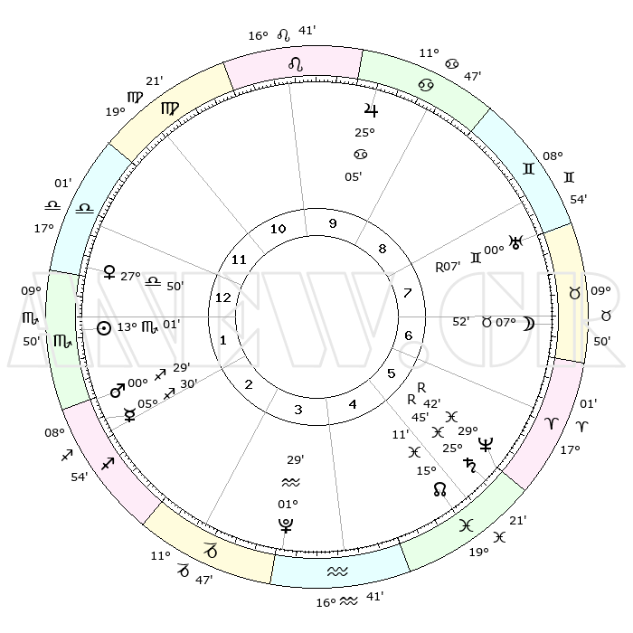 | | ΘΕΣΕΙΣ ΠΛΑΝΗΤΩΝ ΑΣΤΡΟΛΟΓΙΚΟΥ ΧΑΡΤΗ ΤΗΣ ΣΤΙΓΜΗΣ ΑΥΤΗΣ | | | | Πλανήτης | Ζώδιο | Μοίρες | Δεκαήμ. | Σε οίκο | Απόκλιση | | Ακμές των οίκων | | Ηλιος | Σκορπιός | 12°54' | Δεύτερο | 2 | 15 S 42 | | 1ος | 02°27' | Ζυγός | | Σελήνη | Ταύρος | 05°55' | Πρώτο | 8 | 17 N 07 | | 2ος | 29°13' | Ζυγός | | Ερμής | Τοξότης | 05°26' | Πρώτο | 3 | 23 S 58 | | 3ος | 29°45' | Σκορπιός | | Αφροδίτη | Ζυγός | 27°40' | Τρίτο | 1 | 09 S 19 | | 4ος | 02°46' | Αιγόκερως | | Αρης | Τοξότης | 00°23' | Πρώτο | 3 | 20 S 39 | | 5ος | 05°43' | Υδροχόος | | Δίας | Καρκίνος | 25°05' | Τρίτο | 10 | 21 N 12 | | 6ος | 06°03' | Ιχθείς | | Κρόνος | Ιχθείς | 25°45'R | Τρίτο | 6 | 03 S 57 | | 7ος | 02°27' | Κριός | | Ουρανός | Δίδυμοι | 00°07'R | Πρώτο | 9 | 19 N 58 | | 8ος | 29°13' | Κριός | | Ποσειδώνας | Ιχθείς | 29°43'R | Τρίτο | 6 | 01 S 22 | | 9ος | 29°45' | Ταύρος | | Πλούτωνας | Υδροχόος | 01°29' | Πρώτο | 4 | 23 S 30 | | 10ος | 02°46' | Καρκίνος | | Β. Δεσμός | Ιχθείς | 15°11' | Δεύτερο | 6 | 05 S 50 | | 11ος | 05°43' | Λέων | | Ωροσκόπος | Ζυγός | 02°27' | Πρώτο | | | 12ος | 06°03' | Παρθένος | | Μεσουράνημα | Καρκίνος | 02°46' | Πρώτο | | | |