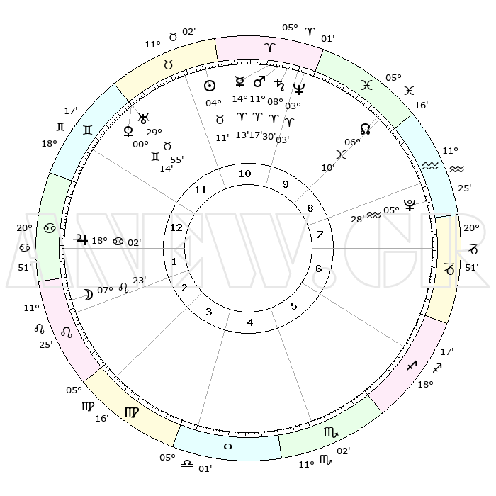 | | ΘΕΣΕΙΣ ΠΛΑΝΗΤΩΝ ΑΣΤΡΟΛΟΓΙΚΟΥ ΧΑΡΤΗ ΤΗΣ ΣΤΙΓΜΗΣ ΑΥΤΗΣ | | | | Πλανήτης | Ζώδιο | Μοίρες | Δεκαήμ. | Σε οίκο | Απόκλιση | | Ακμές των οίκων | | Ηλιος | Ταύρος | 04°08' | Πρώτο | 11 | 12 N 53 | | 1ος | 00°15' | Καρκίνος | | Σελήνη | Λέων | 06°29' | Πρώτο | 2 | 21 N 11 | | 2ος | 21°02' | Καρκίνος | | Ερμής | Κριός | 14°07' | Δεύτερο | 11 | 03 N 17 | | 3ος | 12°51' | Λέων | | Αφροδίτη | Δίδυμοι | 00°09' | Πρώτο | 12 | 20 N 46 | | 4ος | 09°12' | Παρθένος | | Αρης | Κριός | 11°14' | Δεύτερο | 10 | 03 N 35 | | 5ος | 13°11' | Ζυγός | | Δίας | Καρκίνος | 18°02' | Δεύτερο | 1 | 22 N 36 | | 6ος | 23°10' | Σκορπιός | | Κρόνος | Κριός | 08°29' | Πρώτο | 10 | 01 N 23 | | 7ος | 00°15' | Αιγόκερως | | Ουρανός | Ταύρος | 29°55' | Τρίτο | 12 | 19 N 58 | | 8ος | 21°02' | Αιγόκερως | | Ποσειδώνας | Κριός | 03°03' | Πρώτο | 10 | 00 N 00 | | 9ος | 12°51' | Υδροχόος | | Πλούτωνας | Υδροχόος | 05°28' | Πρώτο | 8 | 22 S 48 | | 10ος | 09°12' | Ιχθείς | | Β. Δεσμός | Ιχθείς | 06°10' | Πρώτο | 9 | 09 S 15 | | 11ος | 13°11' | Κριός | | Ωροσκόπος | Καρκίνος | 00°15' | Πρώτο | | | 12ος | 23°10' | Ταύρος | | Μεσουράνημα | Ιχθείς | 09°12' | Πρώτο | | | |