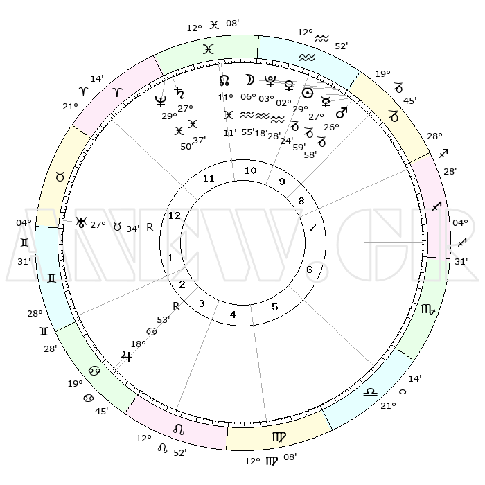 | | ΘΕΣΕΙΣ ΠΛΑΝΗΤΩΝ ΑΣΤΡΟΛΟΓΙΚΟΥ ΧΑΡΤΗ ΤΗΣ ΣΤΙΓΜΗΣ ΑΥΤΗΣ | | | | Πλανήτης | Ζώδιο | Μοίρες | Δεκαήμ. | Σε οίκο | Απόκλιση | | Ακμές των οίκων | | Ηλιος | Αιγόκερως | 29°19' | Τρίτο | 10 | 20 S 17 | | 1ος | 24°26' | Κριός | | Σελήνη | Υδροχόος | 05°52' | Πρώτο | 10 | 21 S 34 | | 2ος | 28°12' | Ταύρος | | Ερμής | Αιγόκερως | 27°51' | Τρίτο | 10 | 22 S 32 | | 3ος | 22°21' | Δίδυμοι | | Αφροδίτη | Υδροχόος | 02°21' | Πρώτο | 10 | 20 S 42 | | 4ος | 14°03' | Καρκίνος | | Αρης | Αιγόκερως | 26°54' | Τρίτο | 10 | 21 S 45 | | 5ος | 07°56' | Λέων | | Δίας | Καρκίνος | 18°54'R | Δεύτερο | 4 | 22 N 23 | | 6ος | 09°34' | Παρθένος | | Κρόνος | Ιχθείς | 27°36' | Τρίτο | 12 | 02 S 59 | | 7ος | 24°26' | Ζυγός | | Ουρανός | Ταύρος | 27°34'R | Τρίτο | 1 | 19 N 25 | | 8ος | 28°12' | Σκορπιός | | Ποσειδώνας | Ιχθείς | 29°50' | Τρίτο | 12 | 01 S 17 | | 9ος | 22°21' | Τοξότης | | Πλούτωνας | Υδροχόος | 03°18' | Πρώτο | 10 | 23 S 06 | | 10ος | 14°03' | Αιγόκερως | | Β. Δεσμός | Ιχθείς | 11°12' | Δεύτερο | 12 | 07 S 22 | | 11ος | 07°56' | Υδροχόος | | Ωροσκόπος | Κριός | 24°26' | Τρίτο | | | 12ος | 09°34' | Ιχθείς | | Μεσουράνημα | Αιγόκερως | 14°03' | Δεύτερο | | | |