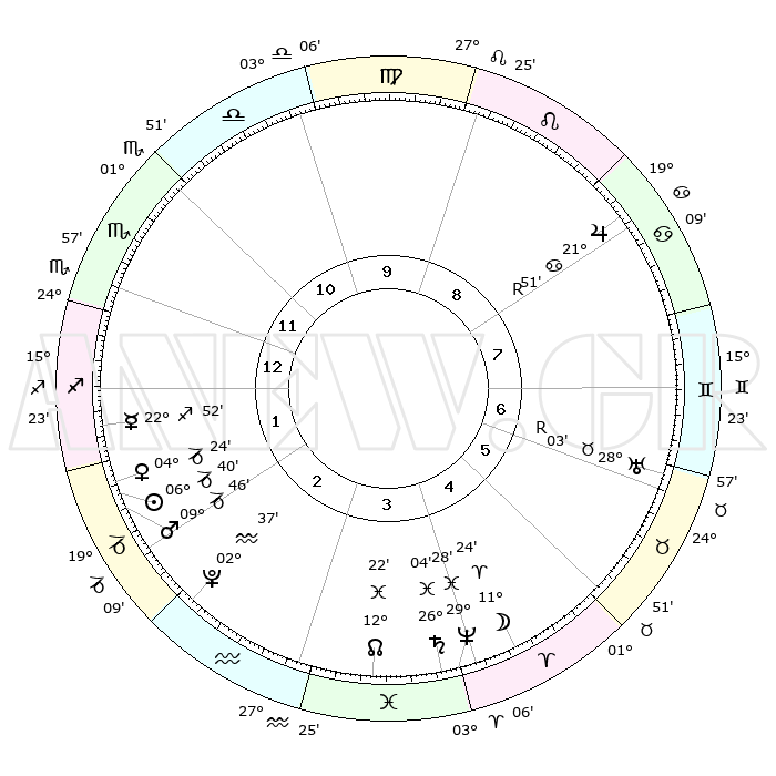 | | ΘΕΣΕΙΣ ΠΛΑΝΗΤΩΝ ΑΣΤΡΟΛΟΓΙΚΟΥ ΧΑΡΤΗ ΤΗΣ ΣΤΙΓΜΗΣ ΑΥΤΗΣ | | | | Πλανήτης | Ζώδιο | Μοίρες | Δεκαήμ. | Σε οίκο | Απόκλιση | | Ακμές των οίκων | | Ηλιος | Αιγόκερως | 06°31' | Πρώτο | 3 | 23 S 16 | | 1ος | 01°52' | Σκορπιός | | Σελήνη | Κριός | 09°22' | Πρώτο | 6 | 05 N 55 | | 2ος | 00°23' | Τοξότης | | Ερμής | Τοξότης | 22°39' | Τρίτο | 2 | 23 S 21 | | 3ος | 02°30' | Αιγόκερως | | Αφροδίτη | Αιγόκερως | 04°13' | Πρώτο | 3 | 23 S 43 | | 4ος | 06°49' | Υδροχόος | | Αρης | Αιγόκερως | 09°39' | Πρώτο | 3 | 23 S 57 | | 5ος | 09°42' | Ιχθείς | | Δίας | Καρκίνος | 21°52'R | Τρίτο | 9 | 21 N 53 | | 6ος | 08°12' | Κριός | | Κρόνος | Ιχθείς | 26°04' | Τρίτο | 5 | 03 S 39 | | 7ος | 01°52' | Ταύρος | | Ουρανός | Ταύρος | 28°03'R | Τρίτο | 7 | 19 N 32 | | 8ος | 00°23' | Δίδυμοι | | Ποσειδώνας | Ιχθείς | 29°28' | Τρίτο | 5 | 01 S 26 | | 9ος | 02°30' | Καρκίνος | | Πλούτωνας | Υδροχόος | 02°36' | Πρώτο | 3 | 23 S 15 | | 10ος | 06°49' | Λέων | | Β. Δεσμός | Ιχθείς | 12°23' | Δεύτερο | 5 | 06 S 55 | | 11ος | 09°42' | Παρθένος | | Ωροσκόπος | Σκορπιός | 01°52' | Πρώτο | | | 12ος | 08°12' | Ζυγός | | Μεσουράνημα | Λέων | 06°49' | Πρώτο | | | |
