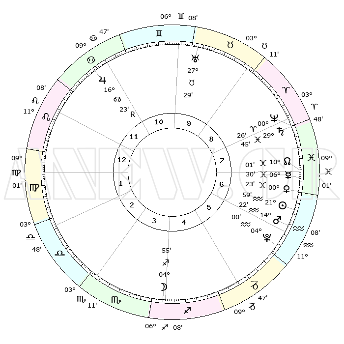 | | ΘΕΣΕΙΣ ΠΛΑΝΗΤΩΝ ΑΣΤΡΟΛΟΓΙΚΟΥ ΧΑΡΤΗ ΤΗΣ ΣΤΙΓΜΗΣ ΑΥΤΗΣ | | | | Πλανήτης | Ζώδιο | Μοίρες | Δεκαήμ. | Σε οίκο | Απόκλιση | | Ακμές των οίκων | | Ηλιος | Υδροχόος | 21°56' | Τρίτο | 6 | 14 S 12 | | 1ος | 23°39' | Λέων | | Σελήνη | Τοξότης | 04°18' | Πρώτο | 4 | 26 S 09 | | 2ος | 16°50' | Παρθένος | | Ερμής | Ιχθείς | 06°25' | Πρώτο | 7 | 09 S 53 | | 3ος | 14°53' | Ζυγός | | Αφροδίτη | Ιχθείς | 00°19' | Πρώτο | 7 | 12 S 43 | | 4ος | 17°40' | Σκορπιός | | Αρης | Υδροχόος | 14°19' | Δεύτερο | 6 | 17 S 33 | | 5ος | 22°19' | Τοξότης | | Δίας | Καρκίνος | 16°23'R | Δεύτερο | 11 | 22 N 45 | | 6ος | 24°50' | Αιγόκερως | | Κρόνος | Ιχθείς | 29°45' | Τρίτο | 8 | 02 S 05 | | 7ος | 23°39' | Υδροχόος | | Ουρανός | Ταύρος | 27°29' | Τρίτο | 10 | 19 N 25 | | 8ος | 16°50' | Ιχθείς | | Ποσειδώνας | Κριός | 00°26' | Πρώτο | 8 | 01 S 02 | | 9ος | 14°53' | Κριός | | Πλούτωνας | Υδροχόος | 04°00' | Πρώτο | 6 | 22 S 58 | | 10ος | 17°40' | Ταύρος | | Β. Δεσμός | Ιχθείς | 10°01' | Δεύτερο | 7 | 07 S 49 | | 11ος | 22°19' | Δίδυμοι | | Ωροσκόπος | Λέων | 23°39' | Τρίτο | | | 12ος | 24°50' | Καρκίνος | | Μεσουράνημα | Ταύρος | 17°40' | Δεύτερο | | | |