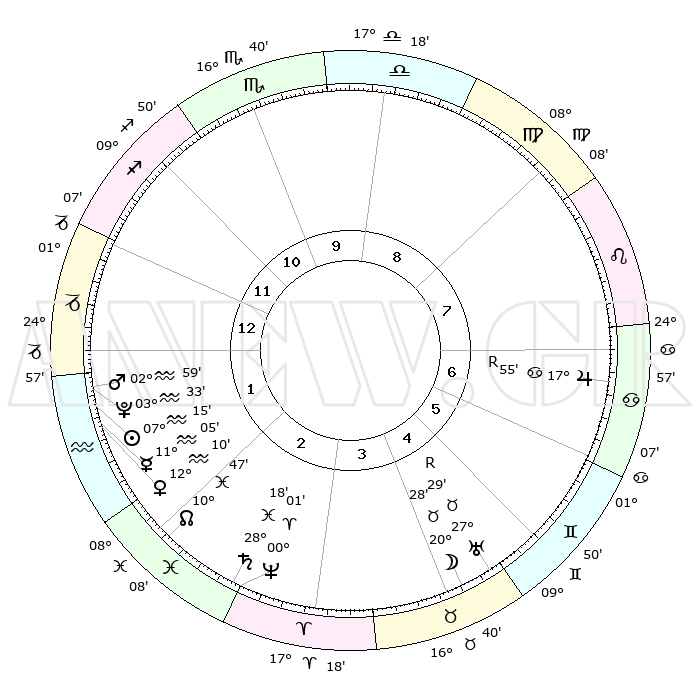 | | ΘΕΣΕΙΣ ΠΛΑΝΗΤΩΝ ΑΣΤΡΟΛΟΓΙΚΟΥ ΧΑΡΤΗ ΤΗΣ ΣΤΙΓΜΗΣ ΑΥΤΗΣ | | | | Πλανήτης | Ζώδιο | Μοίρες | Δεκαήμ. | Σε οίκο | Απόκλιση | | Ακμές των οίκων | | Ηλιος | Υδροχόος | 07°12' | Πρώτο | 1 | 18 S 28 | | 1ος | 01°04' | Αιγόκερως | | Σελήνη | Ταύρος | 19°32' | Δεύτερο | 5 | 22 N 19 | | 2ος | 08°29' | Υδροχόος | | Ερμής | Υδροχόος | 10°59' | Δεύτερο | 2 | 19 S 28 | | 3ος | 18°33' | Ιχθείς | | Αφροδίτη | Υδροχόος | 12°05' | Δεύτερο | 2 | 18 S 24 | | 4ος | 22°19' | Κριός | | Αρης | Υδροχόος | 02°56' | Πρώτο | 1 | 20 S 30 | | 5ος | 18°28' | Ταύρος | | Δίας | Καρκίνος | 17°55'R | Δεύτερο | 7 | 22 N 32 | | 6ος | 10°12' | Δίδυμοι | | Κρόνος | Ιχθείς | 28°17' | Τρίτο | 3 | 02 S 41 | | 7ος | 01°04' | Καρκίνος | | Ουρανός | Ταύρος | 27°29'R | Τρίτο | 5 | 19 N 24 | | 8ος | 08°29' | Λέων | | Ποσειδώνας | Κριός | 00°01' | Πρώτο | 3 | 01 S 12 | | 9ος | 18°33' | Παρθένος | | Πλούτωνας | Υδροχόος | 03°33' | Πρώτο | 1 | 23 S 03 | | 10ος | 22°19' | Ζυγός | | Β. Δεσμός | Ιχθείς | 10°47' | Δεύτερο | 2 | 07 S 31 | | 11ος | 18°28' | Σκορπιός | | Ωροσκόπος | Αιγόκερως | 01°04' | Πρώτο | | | 12ος | 10°12' | Τοξότης | | Μεσουράνημα | Ζυγός | 22°19' | Τρίτο | | | |