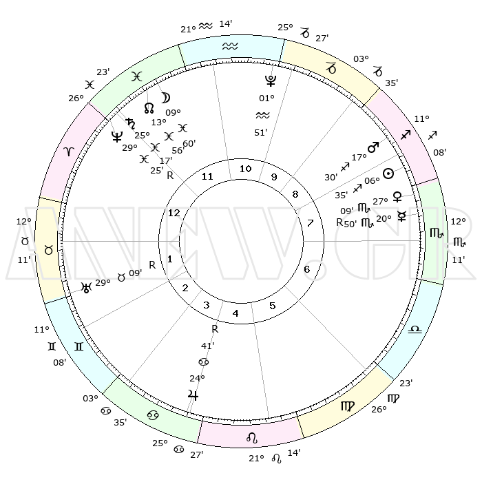 | | ΘΕΣΕΙΣ ΠΛΑΝΗΤΩΝ ΑΣΤΡΟΛΟΓΙΚΟΥ ΧΑΡΤΗ ΤΗΣ ΣΤΙΓΜΗΣ ΑΥΤΗΣ | | | | Πλανήτης | Ζώδιο | Μοίρες | Δεκαήμ. | Σε οίκο | Απόκλιση | | Ακμές των οίκων | | Ηλιος | Τοξότης | 06°33' | Πρώτο | 8 | 21 S 24 | | 1ος | 26°56' | Κριός | | Σελήνη | Ιχθείς | 09°37' | Πρώτο | 11 | 08 S 21 | | 2ος | 00°01' | Δίδυμοι | | Ερμής | Σκορπιός | 20°50'R | Τρίτο | 7 | 15 S 36 | | 3ος | 23°53' | Δίδυμοι | | Αφροδίτη | Σκορπιός | 27°07' | Τρίτο | 7 | 18 S 44 | | 4ος | 15°34' | Καρκίνος | | Αρης | Τοξότης | 17°29' | Δεύτερο | 8 | 23 S 29 | | 5ος | 09°41' | Λέων | | Δίας | Καρκίνος | 24°41'R | Τρίτο | 4 | 21 N 20 | | 6ος | 11°48' | Παρθένος | | Κρόνος | Ιχθείς | 25°17' | Τρίτο | 12 | 04 S 03 | | 7ος | 26°56' | Ζυγός | | Ουρανός | Ταύρος | 29°09'R | Τρίτο | 1 | 19 N 46 | | 8ος | 00°01' | Τοξότης | | Ποσειδώνας | Ιχθείς | 29°25'R | Τρίτο | 12 | 01 S 29 | | 9ος | 23°53' | Τοξότης | | Πλούτωνας | Υδροχόος | 01°51' | Πρώτο | 10 | 23 S 25 | | 10ος | 15°34' | Αιγόκερως | | Β. Δεσμός | Ιχθείς | 13°56' | Δεύτερο | 12 | 06 S 19 | | 11ος | 09°41' | Υδροχόος | | Ωροσκόπος | Κριός | 26°56' | Τρίτο | | | 12ος | 11°48' | Ιχθείς | | Μεσουράνημα | Αιγόκερως | 15°34' | Δεύτερο | | | |