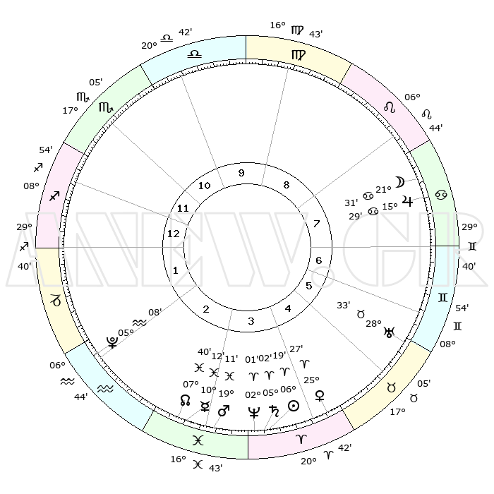 | | ΘΕΣΕΙΣ ΠΛΑΝΗΤΩΝ ΑΣΤΡΟΛΟΓΙΚΟΥ ΧΑΡΤΗ ΤΗΣ ΣΤΙΓΜΗΣ ΑΥΤΗΣ | | | | Πλανήτης | Ζώδιο | Μοίρες | Δεκαήμ. | Σε οίκο | Απόκλιση | | Ακμές των οίκων | | Ηλιος | Κριός | 06°15' | Πρώτο | 4 | 02 N 29 | | 1ος | 08°02' | Τοξότης | | Σελήνη | Καρκίνος | 20°33' | Τρίτο | 8 | 25 N 43 | | 2ος | 10°25' | Αιγόκερως | | Ερμής | Ιχθείς | 10°10' | Δεύτερο | 3 | 08 S 07 | | 3ος | 17°29' | Υδροχόος | | Αφροδίτη | Κριός | 25°22' | Τρίτο | 5 | 09 N 13 | | 4ος | 23°32' | Ιχθείς | | Αρης | Ιχθείς | 19°08' | Δεύτερο | 3 | 05 S 16 | | 5ος | 23°27' | Κριός | | Δίας | Καρκίνος | 15°29' | Δεύτερο | 8 | 22 N 54 | | 6ος | 17°26' | Ταύρος | | Κρόνος | Κριός | 05°02' | Πρώτο | 4 | 00 N 03 | | 7ος | 08°02' | Δίδυμοι | | Ουρανός | Ταύρος | 28°33' | Τρίτο | 6 | 19 N 40 | | 8ος | 10°25' | Καρκίνος | | Ποσειδώνας | Κριός | 02°01' | Πρώτο | 4 | 00 S 24 | | 9ος | 17°29' | Λέων | | Πλούτωνας | Υδροχόος | 05°08' | Πρώτο | 2 | 22 S 48 | | 10ος | 23°32' | Παρθένος | | Β. Δεσμός | Ιχθείς | 07°40' | Πρώτο | 3 | 08 S 41 | | 11ος | 23°27' | Ζυγός | | Ωροσκόπος | Τοξότης | 08°02' | Πρώτο | | | 12ος | 17°26' | Σκορπιός | | Μεσουράνημα | Παρθένος | 23°32' | Τρίτο | | | |