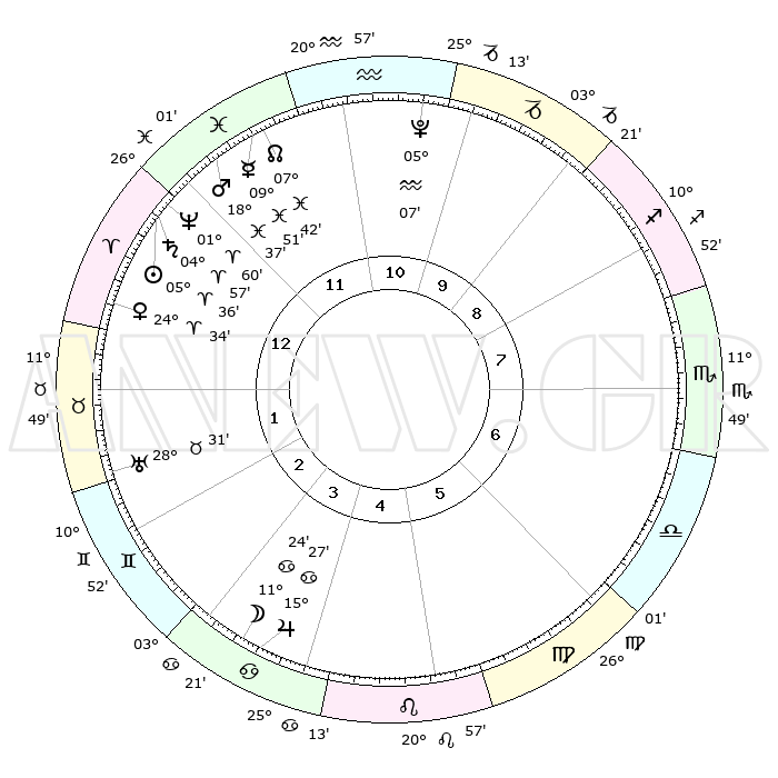 | | ΘΕΣΕΙΣ ΠΛΑΝΗΤΩΝ ΑΣΤΡΟΛΟΓΙΚΟΥ ΧΑΡΤΗ ΤΗΣ ΣΤΙΓΜΗΣ ΑΥΤΗΣ | | | | Πλανήτης | Ζώδιο | Μοίρες | Δεκαήμ. | Σε οίκο | Απόκλιση | | Ακμές των οίκων | | Ηλιος | Κριός | 05°32' | Πρώτο | 1 | 02 N 12 | | 1ος | 03°01' | Κριός | | Σελήνη | Καρκίνος | 10°25' | Δεύτερο | 4 | 27 N 28 | | 2ος | 12°34' | Ταύρος | | Ερμής | Ιχθείς | 09°49' | Πρώτο | 12 | 08 S 07 | | 3ος | 09°31' | Δίδυμοι | | Αφροδίτη | Κριός | 24°28' | Τρίτο | 1 | 08 N 51 | | 4ος | 01°41' | Καρκίνος | | Αρης | Ιχθείς | 18°34' | Δεύτερο | 12 | 05 S 30 | | 5ος | 24°08' | Καρκίνος | | Δίας | Καρκίνος | 15°27' | Δεύτερο | 4 | 22 N 54 | | 6ος | 22°00' | Λέων | | Κρόνος | Κριός | 04°56' | Πρώτο | 1 | 00 N 01 | | 7ος | 03°01' | Ζυγός | | Ουρανός | Ταύρος | 28°31' | Τρίτο | 2 | 19 N 39 | | 8ος | 12°34' | Σκορπιός | | Ποσειδώνας | Κριός | 01°59' | Πρώτο | 12 | 00 S 24 | | 9ος | 09°31' | Τοξότης | | Πλούτωνας | Υδροχόος | 05°07' | Πρώτο | 11 | 22 S 48 | | 10ος | 01°41' | Αιγόκερως | | Β. Δεσμός | Ιχθείς | 07°43' | Πρώτο | 12 | 08 S 41 | | 11ος | 24°08' | Αιγόκερως | | Ωροσκόπος | Κριός | 03°01' | Πρώτο | | | 12ος | 22°00' | Υδροχόος | | Μεσουράνημα | Αιγόκερως | 01°41' | Πρώτο | | | |