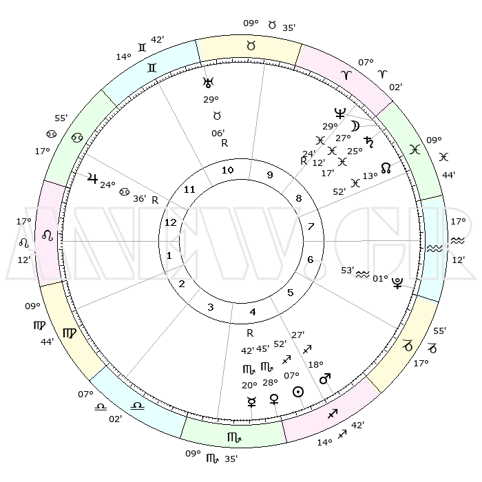 | | ΘΕΣΕΙΣ ΠΛΑΝΗΤΩΝ ΑΣΤΡΟΛΟΓΙΚΟΥ ΧΑΡΤΗ ΤΗΣ ΣΤΙΓΜΗΣ ΑΥΤΗΣ | | | | Πλανήτης | Ζώδιο | Μοίρες | Δεκαήμ. | Σε οίκο | Απόκλιση | | Ακμές των οίκων | | Ηλιος | Τοξότης | 07°03' | Πρώτο | 2 | 21 S 29 | | 1ος | 09°42' | Ζυγός | | Σελήνη | Ιχθείς | 16°04' | Δεύτερο | 6 | 05 S 21 | | 2ος | 06°56' | Σκορπιός | | Ερμής | Σκορπιός | 20°45'R | Τρίτο | 2 | 15 S 32 | | 3ος | 07°45' | Τοξότης | | Αφροδίτη | Σκορπιός | 27°44' | Τρίτο | 2 | 18 S 54 | | 4ος | 10°55' | Αιγόκερως | | Αρης | Τοξότης | 17°51' | Δεύτερο | 3 | 23 S 31 | | 5ος | 13°51' | Υδροχόος | | Δίας | Καρκίνος | 24°39'R | Τρίτο | 10 | 21 N 20 | | 6ος | 13°53' | Ιχθείς | | Κρόνος | Ιχθείς | 25°17' | Τρίτο | 6 | 04 S 03 | | 7ος | 09°42' | Κριός | | Ουρανός | Ταύρος | 29°08'R | Τρίτο | 8 | 19 N 45 | | 8ος | 06°56' | Ταύρος | | Ποσειδώνας | Ιχθείς | 29°25'R | Τρίτο | 6 | 01 S 29 | | 9ος | 07°45' | Δίδυμοι | | Πλούτωνας | Υδροχόος | 01°52' | Πρώτο | 4 | 23 S 25 | | 10ος | 10°55' | Καρκίνος | | Β. Δεσμός | Ιχθείς | 13°55' | Δεύτερο | 6 | 06 S 20 | | 11ος | 13°51' | Λέων | | Ωροσκόπος | Ζυγός | 09°42' | Πρώτο | | | 12ος | 13°53' | Παρθένος | | Μεσουράνημα | Καρκίνος | 10°55' | Δεύτερο | | | |