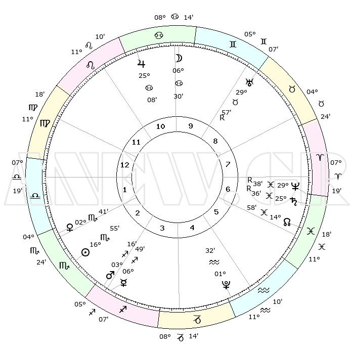 | | ΘΕΣΕΙΣ ΠΛΑΝΗΤΩΝ ΑΣΤΡΟΛΟΓΙΚΟΥ ΧΑΡΤΗ ΤΗΣ ΣΤΙΓΜΗΣ ΑΥΤΗΣ | | | | Πλανήτης | Ζώδιο | Μοίρες | Δεκαήμ. | Σε οίκο | Απόκλιση | | Ακμές των οίκων | | Ηλιος | Σκορπιός | 16°50' | Δεύτερο | 3 | 16 S 52 | | 1ος | 13°10' | Παρθένος | | Σελήνη | Καρκίνος | 05°18' | Πρώτο | 10 | 28 N 07 | | 2ος | 08°21' | Ζυγός | | Ερμής | Τοξότης | 06°49' | Πρώτο | 3 | 23 S 52 | | 3ος | 08°00' | Σκορπιός | | Αφροδίτη | Σκορπιός | 02°35' | Πρώτο | 2 | 11 S 06 | | 4ος | 10°57' | Τοξότης | | Αρης | Τοξότης | 03°12' | Πρώτο | 3 | 21 S 15 | | 5ος | 14°23' | Αιγόκερως | | Δίας | Καρκίνος | 25°08' | Τρίτο | 11 | 21 N 12 | | 6ος | 15°31' | Υδροχόος | | Κρόνος | Ιχθείς | 25°36'R | Τρίτο | 7 | 03 S 59 | | 7ος | 13°10' | Ιχθείς | | Ουρανός | Ταύρος | 29°57'R | Τρίτο | 9 | 19 N 56 | | 8ος | 08°21' | Κριός | | Ποσειδώνας | Ιχθείς | 29°39'R | Τρίτο | 7 | 01 S 24 | | 9ος | 08°00' | Ταύρος | | Πλούτωνας | Υδροχόος | 01°32' | Πρώτο | 5 | 23 S 29 | | 10ος | 10°57' | Δίδυμοι | | Β. Δεσμός | Ιχθείς | 14°59' | Δεύτερο | 7 | 05 S 55 | | 11ος | 14°23' | Καρκίνος | | Ωροσκόπος | Παρθένος | 13°10' | Δεύτερο | | | 12ος | 15°31' | Λέων | | Μεσουράνημα | Δίδυμοι | 10°57' | Δεύτερο | | | |