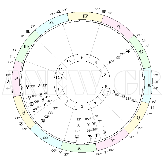 | | ΘΕΣΕΙΣ ΠΛΑΝΗΤΩΝ ΑΣΤΡΟΛΟΓΙΚΟΥ ΧΑΡΤΗ ΤΗΣ ΣΤΙΓΜΗΣ ΑΥΤΗΣ | | | | Πλανήτης | Ζώδιο | Μοίρες | Δεκαήμ. | Σε οίκο | Απόκλιση | | Ακμές των οίκων | | Ηλιος | Αιγόκερως | 07°11' | Πρώτο | 6 | 23 S 14 | | 1ος | 20°38' | Καρκίνος | | Σελήνη | Κριός | 18°23' | Δεύτερο | 10 | 10 N 02 | | 2ος | 11°12' | Λέων | | Ερμής | Τοξότης | 23°37' | Τρίτο | 6 | 23 S 28 | | 3ος | 05°01' | Παρθένος | | Αφροδίτη | Αιγόκερως | 05°02' | Πρώτο | 6 | 23 S 43 | | 4ος | 04°44' | Ζυγός | | Αρης | Αιγόκερως | 10°09' | Δεύτερο | 6 | 23 S 55 | | 5ος | 10°45' | Σκορπιός | | Δίας | Καρκίνος | 21°47'R | Τρίτο | 1 | 21 N 54 | | 6ος | 18°02' | Τοξότης | | Κρόνος | Ιχθείς | 26°06' | Τρίτο | 9 | 03 S 38 | | 7ος | 20°38' | Αιγόκερως | | Ουρανός | Ταύρος | 28°02'R | Τρίτο | 11 | 19 N 31 | | 8ος | 11°12' | Υδροχόος | | Ποσειδώνας | Ιχθείς | 29°28' | Τρίτο | 9 | 01 S 26 | | 9ος | 05°01' | Ιχθείς | | Πλούτωνας | Υδροχόος | 02°37' | Πρώτο | 7 | 23 S 14 | | 10ος | 04°44' | Κριός | | Β. Δεσμός | Ιχθείς | 12°21' | Δεύτερο | 9 | 06 S 56 | | 11ος | 10°45' | Ταύρος | | Ωροσκόπος | Καρκίνος | 20°38' | Τρίτο | | | 12ος | 18°02' | Δίδυμοι | | Μεσουράνημα | Κριός | 04°44' | Πρώτο | | | |
