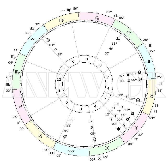 | | ΘΕΣΕΙΣ ΠΛΑΝΗΤΩΝ ΑΣΤΡΟΛΟΓΙΚΟΥ ΧΑΡΤΗ ΤΗΣ ΣΤΙΓΜΗΣ ΑΥΤΗΣ | | | | Πλανήτης | Ζώδιο | Μοίρες | Δεκαήμ. | Σε οίκο | Απόκλιση | | Ακμές των οίκων | | Ηλιος | Ταύρος | 07°09' | Πρώτο | 10 | 13 N 54 | | 1ος | 06°55' | Λέων | | Σελήνη | Παρθένος | 17°37' | Δεύτερο | 2 | 04 N 03 | | 2ος | 28°29' | Λέων | | Ερμής | Κριός | 19°28' | Δεύτερο | 9 | 05 N 31 | | 3ος | 24°28' | Παρθένος | | Αφροδίτη | Δίδυμοι | 03°56' | Πρώτο | 11 | 21 N 39 | | 4ος | 26°16' | Ζυγός | | Αρης | Κριός | 13°37' | Δεύτερο | 9 | 04 N 32 | | 5ος | 02°02' | Τοξότης | | Δίας | Καρκίνος | 18°26' | Δεύτερο | 12 | 22 N 33 | | 6ος | 06°39' | Αιγόκερως | | Κρόνος | Κριός | 08°51' | Πρώτο | 9 | 01 N 31 | | 7ος | 06°55' | Υδροχόος | | Ουρανός | Δίδυμοι | 00°05' | Πρώτο | 10 | 20 N 00 | | 8ος | 28°29' | Υδροχόος | | Ποσειδώνας | Κριός | 03°09' | Πρώτο | 9 | 00 N 03 | | 9ος | 24°28' | Ιχθείς | | Πλούτωνας | Υδροχόος | 05°29' | Πρώτο | 6 | 22 S 48 | | 10ος | 26°16' | Κριός | | Β. Δεσμός | Ιχθείς | 06°00' | Πρώτο | 8 | 09 S 18 | | 11ος | 02°02' | Δίδυμοι | | Ωροσκόπος | Λέων | 06°55' | Πρώτο | | | 12ος | 06°39' | Καρκίνος | | Μεσουράνημα | Κριός | 26°16' | Τρίτο | | | |