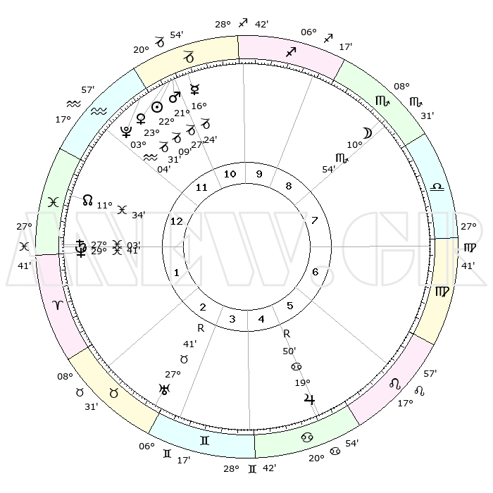 | | ΘΕΣΕΙΣ ΠΛΑΝΗΤΩΝ ΑΣΤΡΟΛΟΓΙΚΟΥ ΧΑΡΤΗ ΤΗΣ ΣΤΙΓΜΗΣ ΑΥΤΗΣ | | | | Πλανήτης | Ζώδιο | Μοίρες | Δεκαήμ. | Σε οίκο | Απόκλιση | | Ακμές των οίκων | | Ηλιος | Αιγόκερως | 22°06' | Τρίτο | 11 | 21 S 37 | | 1ος | 26°14' | Υδροχόος | | Σελήνη | Σκορπιός | 10°14' | Δεύτερο | 8 | 19 S 06 | | 2ος | 11°54' | Κριός | | Ερμής | Αιγόκερως | 16°19' | Δεύτερο | 11 | 24 S 02 | | 3ος | 15°22' | Ταύρος | | Αφροδίτη | Αιγόκερως | 23°27' | Τρίτο | 11 | 22 S 17 | | 4ος | 10°09' | Δίδυμοι | | Αρης | Αιγόκερως | 21°25' | Τρίτο | 11 | 22 S 41 | | 5ος | 01°52' | Καρκίνος | | Δίας | Καρκίνος | 19°50'R | Δεύτερο | 5 | 22 N 14 | | 6ος | 25°03' | Καρκίνος | | Κρόνος | Ιχθείς | 27°02' | Τρίτο | 1 | 03 S 13 | | 7ος | 26°14' | Λέων | | Ουρανός | Ταύρος | 27°41'R | Τρίτο | 3 | 19 N 27 | | 8ος | 11°54' | Ζυγός | | Ποσειδώνας | Ιχθείς | 29°41' | Τρίτο | 1 | 01 S 21 | | 9ος | 15°22' | Σκορπιός | | Πλούτωνας | Υδροχόος | 03°04' | Πρώτο | 12 | 23 S 09 | | 10ος | 10°09' | Τοξότης | | Β. Δεσμός | Ιχθείς | 11°34' | Δεύτερο | 1 | 07 S 13 | | 11ος | 01°52' | Αιγόκερως | | Ωροσκόπος | Υδροχόος | 26°14' | Τρίτο | | | 12ος | 25°03' | Αιγόκερως | | Μεσουράνημα | Τοξότης | 10°09' | Δεύτερο | | | |