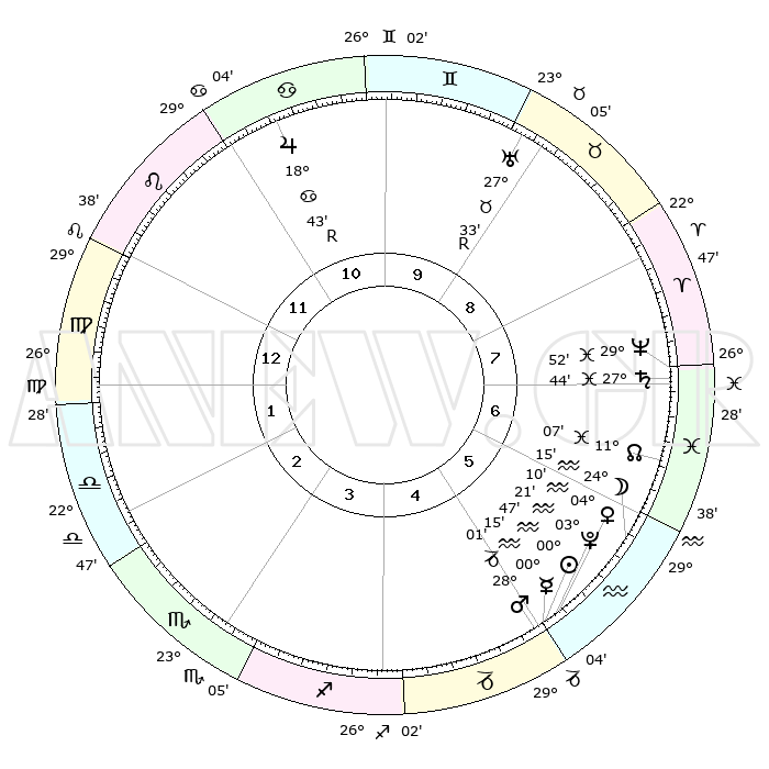 | | ΘΕΣΕΙΣ ΠΛΑΝΗΤΩΝ ΑΣΤΡΟΛΟΓΙΚΟΥ ΧΑΡΤΗ ΤΗΣ ΣΤΙΓΜΗΣ ΑΥΤΗΣ | | | | Πλανήτης | Ζώδιο | Μοίρες | Δεκαήμ. | Σε οίκο | Απόκλιση | | Ακμές των οίκων | | Ηλιος | Υδροχόος | 00°41' | Πρώτο | 6 | 20 S 00 | | 1ος | 26°09' | Λέων | | Σελήνη | Υδροχόος | 22°55' | Τρίτο | 6 | 15 S 16 | | 2ος | 19°36' | Παρθένος | | Ερμής | Υδροχόος | 00°05' | Πρώτο | 6 | 22 S 07 | | 3ος | 17°54' | Ζυγός | | Αφροδίτη | Υδροχόος | 04°02' | Πρώτο | 6 | 20 S 21 | | 4ος | 20°45' | Σκορπιός | | Αρης | Αιγόκερως | 27°57' | Τρίτο | 6 | 21 S 33 | | 5ος | 25°13' | Τοξότης | | Δίας | Καρκίνος | 18°43'R | Δεύτερο | 11 | 22 N 24 | | 6ος | 27°30' | Αιγόκερως | | Κρόνος | Ιχθείς | 27°43' | Τρίτο | 8 | 02 S 56 | | 7ος | 26°09' | Υδροχόος | | Ουρανός | Ταύρος | 27°33'R | Τρίτο | 10 | 19 N 25 | | 8ος | 19°36' | Ιχθείς | | Ποσειδώνας | Ιχθείς | 29°52' | Τρίτο | 8 | 01 S 16 | | 9ος | 17°54' | Κριός | | Πλούτωνας | Υδροχόος | 03°20' | Πρώτο | 6 | 23 S 06 | | 10ος | 20°45' | Ταύρος | | Β. Δεσμός | Ιχθείς | 11°07' | Δεύτερο | 7 | 07 S 24 | | 11ος | 25°13' | Δίδυμοι | | Ωροσκόπος | Λέων | 26°09' | Τρίτο | | | 12ος | 27°30' | Καρκίνος | | Μεσουράνημα | Ταύρος | 20°45' | Τρίτο | | | |