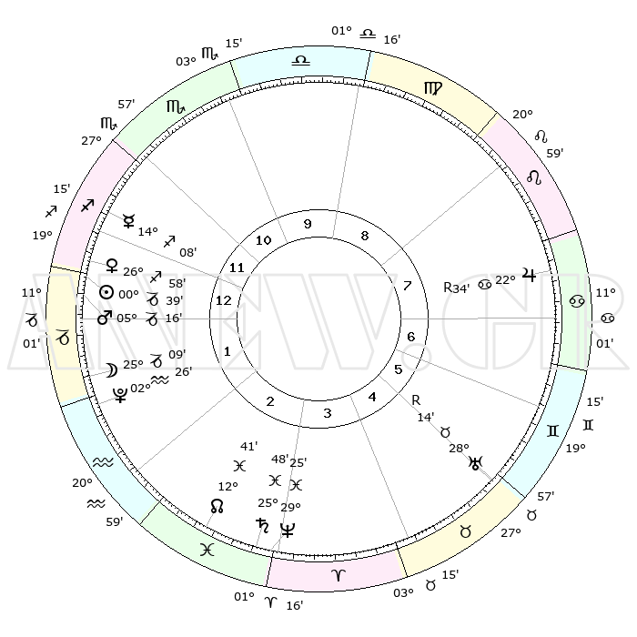 | | ΘΕΣΕΙΣ ΠΛΑΝΗΤΩΝ ΑΣΤΡΟΛΟΓΙΚΟΥ ΧΑΡΤΗ ΤΗΣ ΣΤΙΓΜΗΣ ΑΥΤΗΣ | | | | Πλανήτης | Ζώδιο | Μοίρες | Δεκαήμ. | Σε οίκο | Απόκλιση | | Ακμές των οίκων | | Ηλιος | Αιγόκερως | 00°31' | Πρώτο | 2 | 23 S 26 | | 1ος | 29°20' | Σκορπιός | | Σελήνη | Αιγόκερως | 23°31' | Τρίτο | 2 | 25 S 04 | | 2ος | 00°22' | Αιγόκερως | | Ερμής | Τοξότης | 13°56' | Δεύτερο | 1 | 21 S 51 | | 3ος | 05°58' | Υδροχόος | | Αφροδίτη | Τοξότης | 26°48' | Τρίτο | 1 | 23 S 31 | | 4ος | 11°60' | Ιχθείς | | Αρης | Αιγόκερως | 05°10' | Πρώτο | 2 | 24 S 09 | | 5ος | 13°07' | Κριός | | Δίας | Καρκίνος | 22°35'R | Τρίτο | 8 | 21 N 45 | | 6ος | 08°15' | Ταύρος | | Κρόνος | Ιχθείς | 25°47' | Τρίτο | 4 | 03 S 47 | | 7ος | 29°20' | Ταύρος | | Ουρανός | Ταύρος | 28°15'R | Τρίτο | 6 | 19 N 34 | | 8ος | 00°22' | Καρκίνος | | Ποσειδώνας | Ιχθείς | 29°25' | Τρίτο | 4 | 01 S 28 | | 9ος | 05°58' | Λέων | | Πλούτωνας | Υδροχόος | 02°26' | Πρώτο | 2 | 23 S 17 | | 10ος | 11°60' | Παρθένος | | Β. Δεσμός | Ιχθείς | 12°42' | Δεύτερο | 4 | 06 S 48 | | 11ος | 13°07' | Ζυγός | | Ωροσκόπος | Σκορπιός | 29°20' | Τρίτο | | | 12ος | 08°15' | Σκορπιός | | Μεσουράνημα | Παρθένος | 11°60' | Δεύτερο | | | |