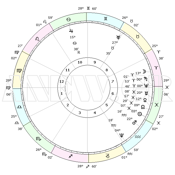 | | ΘΕΣΕΙΣ ΠΛΑΝΗΤΩΝ ΑΣΤΡΟΛΟΓΙΚΟΥ ΧΑΡΤΗ ΤΗΣ ΣΤΙΓΜΗΣ ΑΥΤΗΣ | | | | Πλανήτης | Ζώδιο | Μοίρες | Δεκαήμ. | Σε οίκο | Απόκλιση | | Ακμές των οίκων | | Ηλιος | Ιχθείς | 02°03' | Πρώτο | 6 | 10 S 45 | | 1ος | 07°27' | Παρθένος | | Σελήνη | Κριός | 11°60' | Δεύτερο | 8 | 07 N 24 | | 2ος | 02°05' | Ζυγός | | Ερμής | Ιχθείς | 20°04' | Τρίτο | 7 | 02 S 37 | | 3ος | 01°21' | Σκορπιός | | Αφροδίτη | Ιχθείς | 12°51' | Δεύτερο | 7 | 08 S 04 | | 4ος | 04°19' | Τοξότης | | Αρης | Υδροχόος | 22°12' | Τρίτο | 6 | 15 S 08 | | 5ος | 08°02' | Αιγόκερως | | Δίας | Καρκίνος | 15°38'R | Δεύτερο | 11 | 22 N 51 | | 6ος | 09°29' | Υδροχόος | | Κρόνος | Κριός | 00°52' | Πρώτο | 7 | 01 S 37 | | 7ος | 07°27' | Ιχθείς | | Ουρανός | Ταύρος | 27°35' | Τρίτο | 9 | 19 N 26 | | 8ος | 02°05' | Κριός | | Ποσειδώνας | Κριός | 00°45' | Πρώτο | 7 | 00 S 54 | | 9ος | 01°21' | Ταύρος | | Πλούτωνας | Υδροχόος | 04°18' | Πρώτο | 5 | 22 S 55 | | 10ος | 04°19' | Δίδυμοι | | Β. Δεσμός | Ιχθείς | 09°29' | Πρώτο | 7 | 08 S 01 | | 11ος | 08°02' | Καρκίνος | | Ωροσκόπος | Παρθένος | 07°27' | Πρώτο | | | 12ος | 09°29' | Λέων | | Μεσουράνημα | Δίδυμοι | 04°19' | Πρώτο | | | |