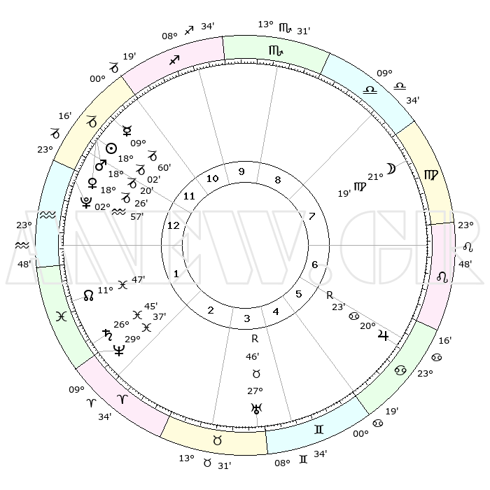 | | ΘΕΣΕΙΣ ΠΛΑΝΗΤΩΝ ΑΣΤΡΟΛΟΓΙΚΟΥ ΧΑΡΤΗ ΤΗΣ ΣΤΙΓΜΗΣ ΑΥΤΗΣ | | | | Πλανήτης | Ζώδιο | Μοίρες | Δεκαήμ. | Σε οίκο | Απόκλιση | | Ακμές των οίκων | | Ηλιος | Αιγόκερως | 16°53' | Δεύτερο | 1 | 22 S 22 | | 1ος | 02°04' | Αιγόκερως | | Σελήνη | Παρθένος | 06°38' | Πρώτο | 8 | 09 N 23 | | 2ος | 09°45' | Υδροχόος | | Ερμής | Αιγόκερως | 08°14' | Πρώτο | 1 | 24 S 22 | | 3ος | 19°53' | Ιχθείς | | Αφροδίτη | Αιγόκερως | 17°01' | Δεύτερο | 1 | 23 S 04 | | 4ος | 23°29' | Κριός | | Αρης | Αιγόκερως | 17°28' | Δεύτερο | 1 | 23 S 13 | | 5ος | 19°28' | Ταύρος | | Δίας | Καρκίνος | 20°32'R | Τρίτο | 7 | 22 N 07 | | 6ος | 11°09' | Δίδυμοι | | Κρόνος | Ιχθείς | 26°41' | Τρίτο | 3 | 03 S 23 | | 7ος | 02°04' | Καρκίνος | | Ουρανός | Ταύρος | 27°47'R | Τρίτο | 5 | 19 N 28 | | 8ος | 09°45' | Λέων | | Ποσειδώνας | Ιχθείς | 29°36' | Τρίτο | 3 | 01 S 23 | | 9ος | 19°53' | Παρθένος | | Πλούτωνας | Υδροχόος | 02°55' | Πρώτο | 1 | 23 S 11 | | 10ος | 23°29' | Ζυγός | | Β. Δεσμός | Ιχθείς | 11°50' | Δεύτερο | 2 | 07 S 07 | | 11ος | 19°28' | Σκορπιός | | Ωροσκόπος | Αιγόκερως | 02°04' | Πρώτο | | | 12ος | 11°09' | Τοξότης | | Μεσουράνημα | Ζυγός | 23°29' | Τρίτο | | | |